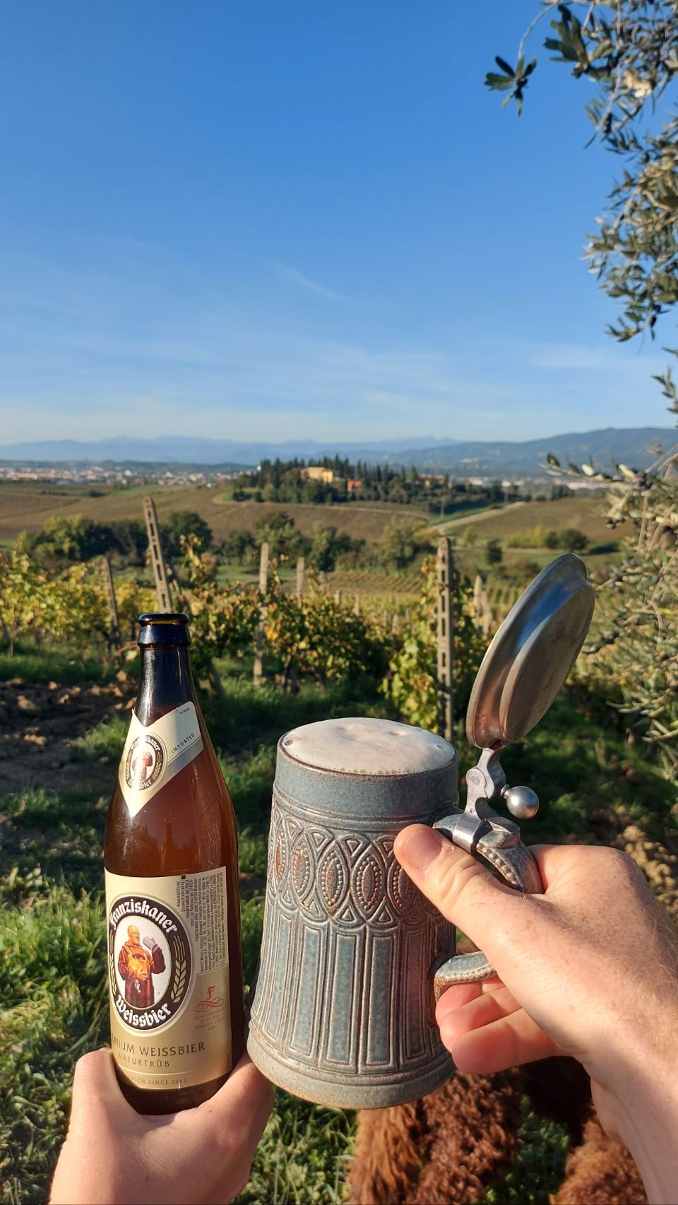 Anmelden können wir uns erst ab sechzehn Uhr, also bewegen wir Flips ein wenig und genießen bei unserem Sonntagsweizen die Aussicht - keine Angst, Wein trinken wir später auch noch.