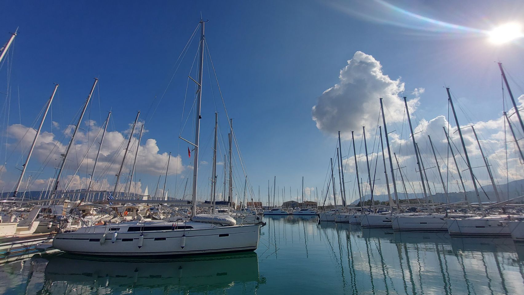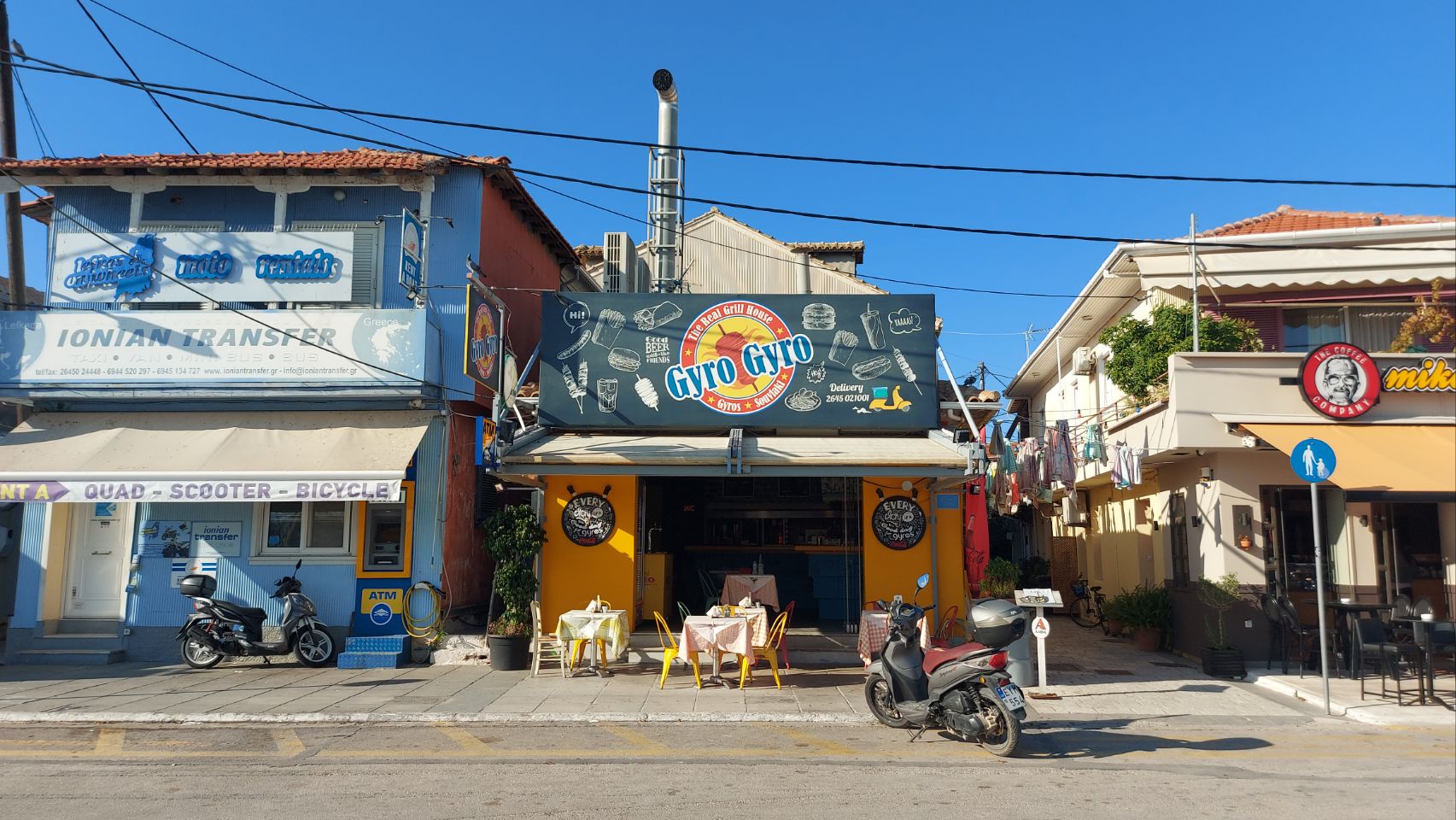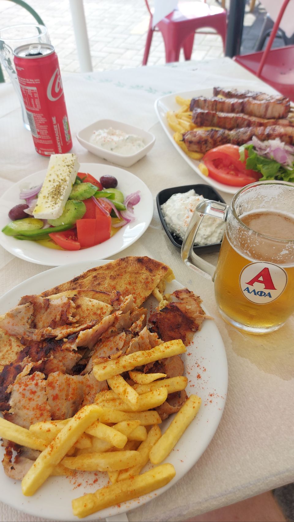 Wir fahren die halbe Stunde zurück nach Norden in die Ortschaft Lefkada. Im Cosmote-Laden bekommt Fini die vorbestellt SIM-Karte und dann bummeln wir durch das Dörfchen bis zum Hafen. Die meisten Geschäfte haben Mittagsruhe und insgesamt ist nicht sehr viel los. Am Yachthafen finden wir dann ein einfaches Restaurant mit einem guten Mittagsangebot, da schlagen wir zu. Es gibt Gyros, Suflaki, Pommes, Pitabrot und Salat mit Zaziki. Es schmeckt richtig gut und ist echt preiswert.