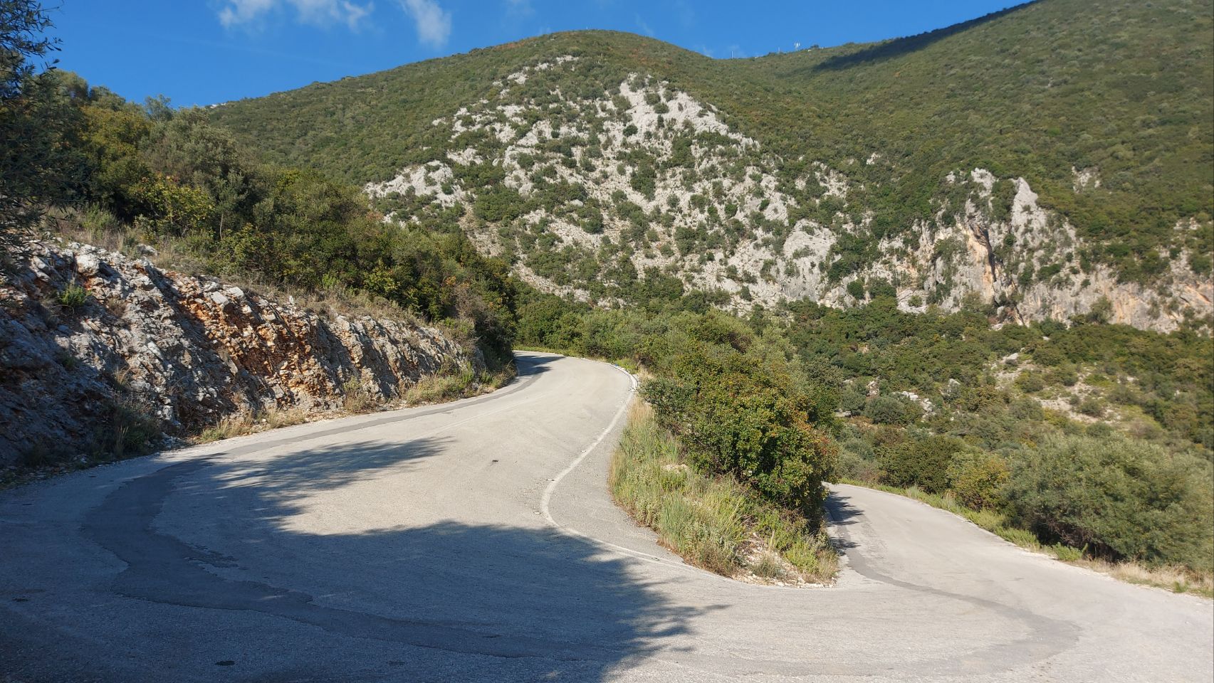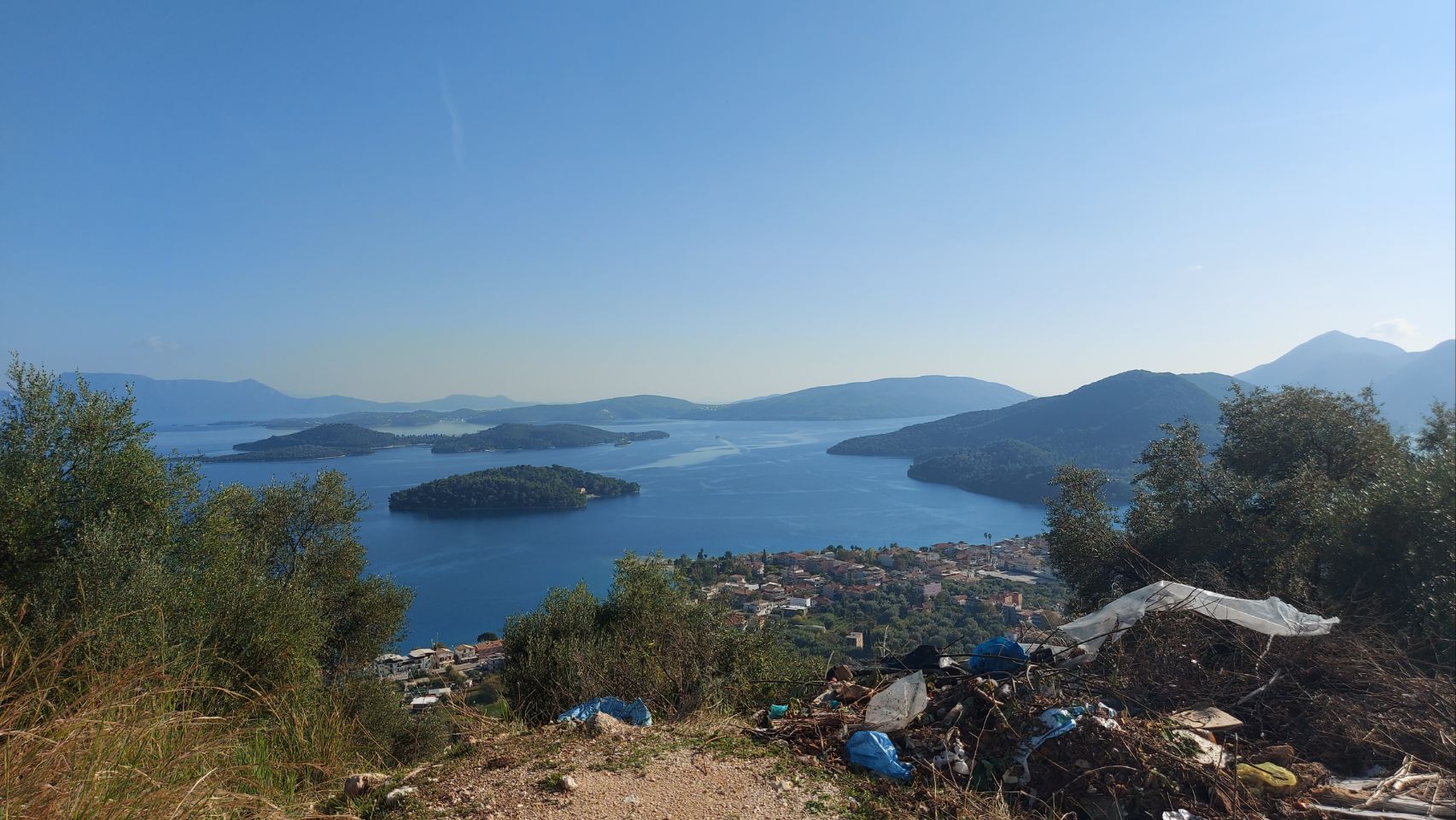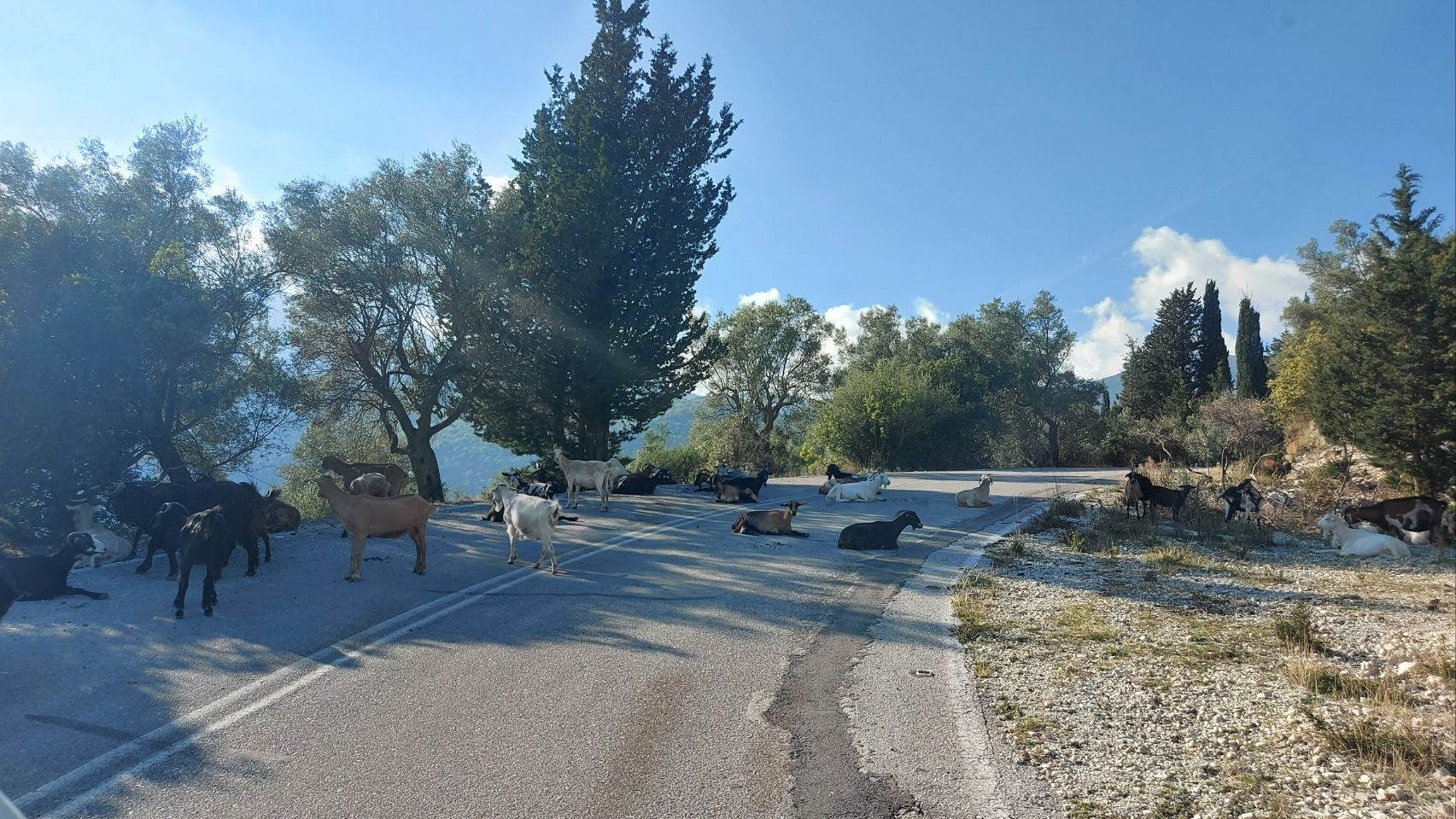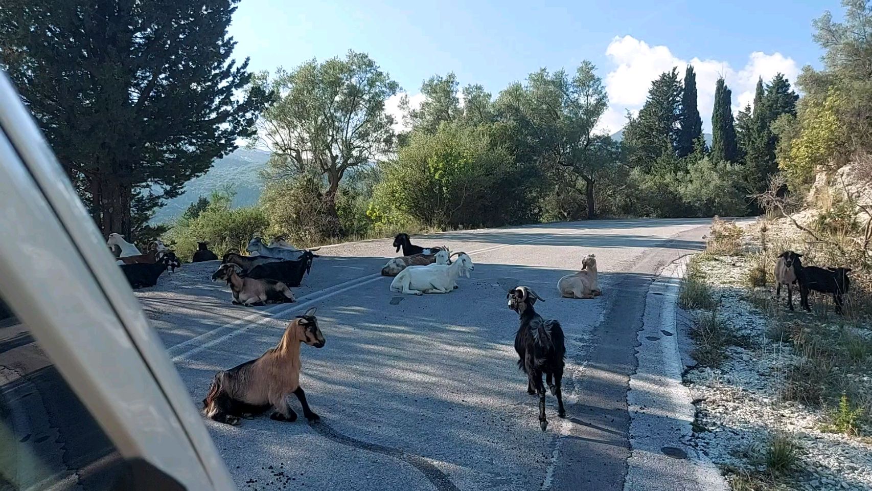 Von den Bergstraßen aus haben wir immer wieder tolle Ausblicke über die Wälder bis zum Meer - und leider auch gelegentlich auf jede Menge Abfall am Straßenrand. Plötzlich müssen wir warten, eine Herde Ziegen hatte es sich auf der Fahrbahn gemütlich gemacht.