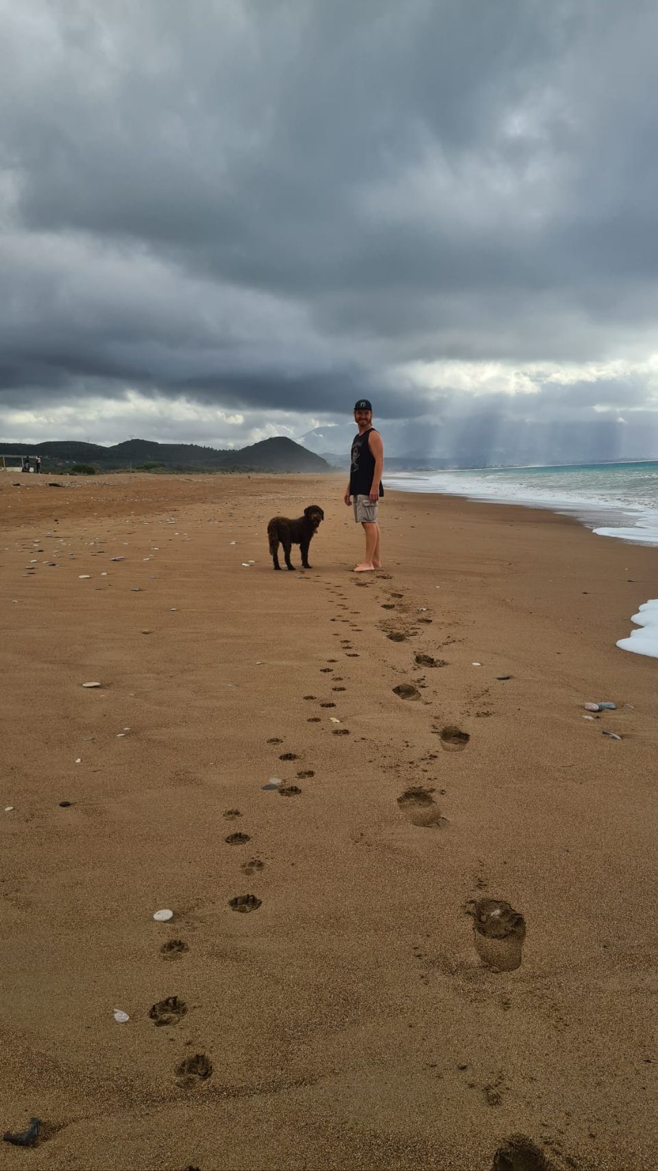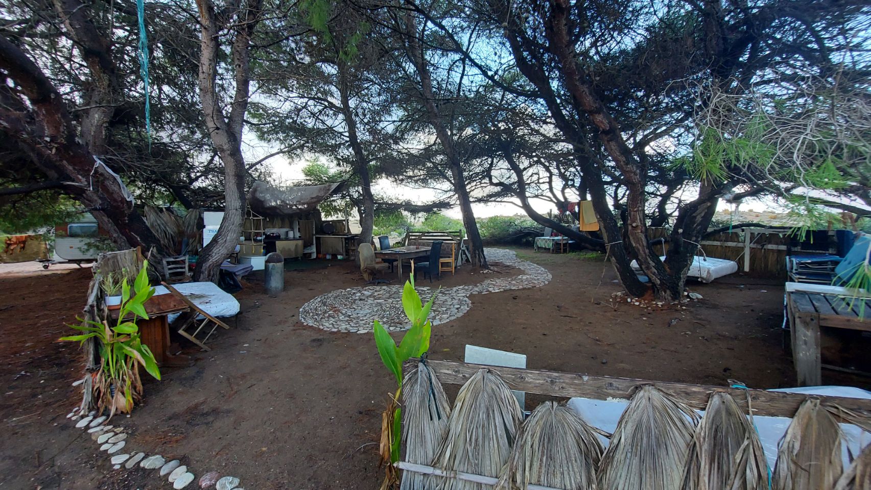 Im Tageslicht des nächsten Morgen sehen wir dann, dass überall um uns herum entlang des Küstenwäldchens Camper, Wohnmobile und ausgebaute Laster stehen. Es gibt zwei, drei Wasserzapfstellen, ein kleines Regal mit Tauschartikeln und immer wieder hängen Mobile aus Strandgut in den Bäumen. Man kann sich tätowieren oder die Haare schneiden lassen, ein Platz ist mit Betten, Tischen, Stühlen und einer provisorischen Küche eingerichtet. Am Strand hat sich jemand eine Bambushütte aufgebaut und etwas weiter steht eine Bar halbe im Sand, die leider schon geschlossen ist. Ein richtiges Aussteigerlager. Wir sind knapp sechs Kilometer unterwegs, bis wir Alles gesehen haben und zurück bei Frido sind.