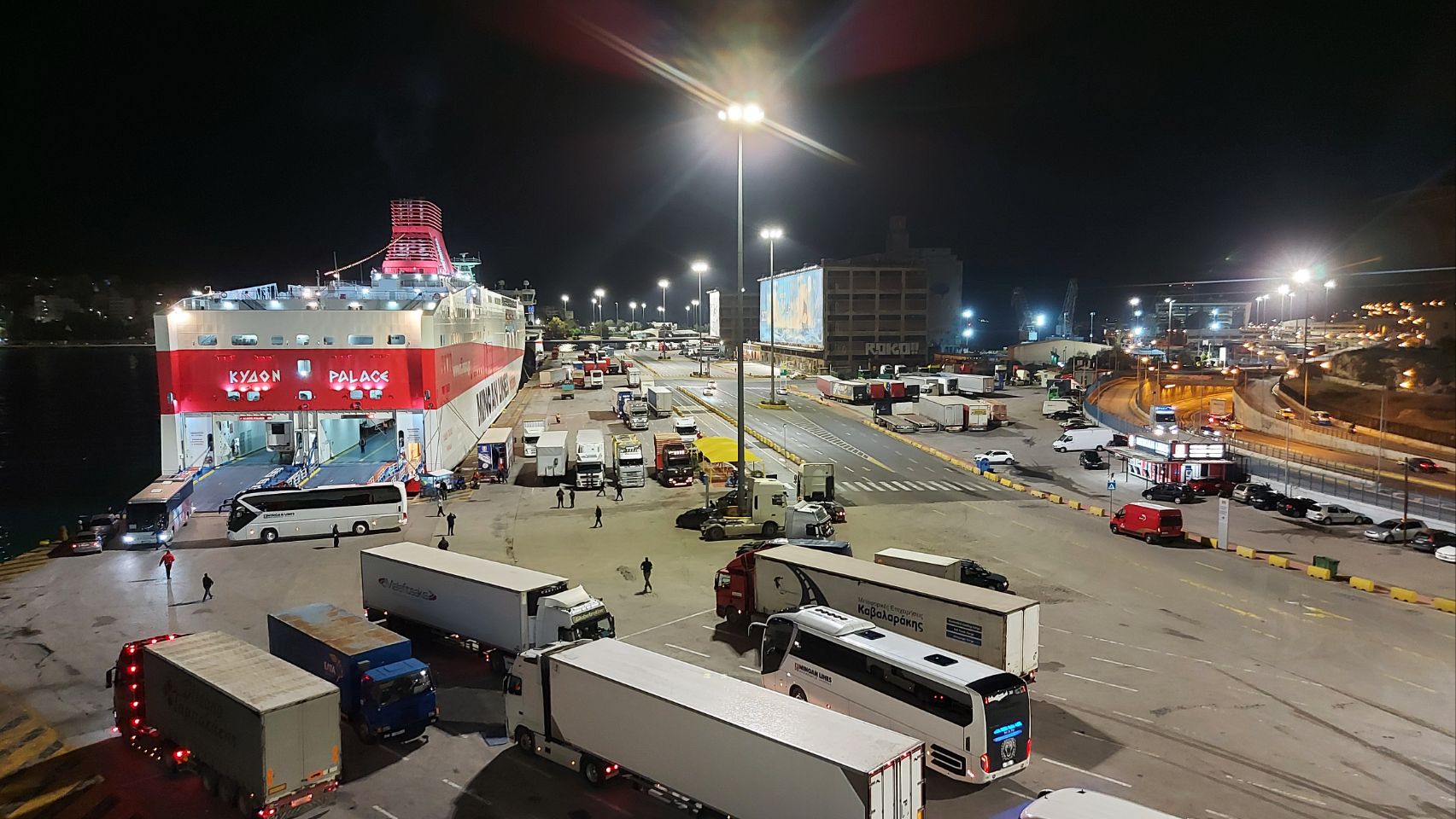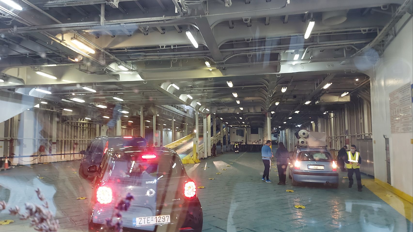 Der Stadtverkehr ist schnell und turbulent, immer wieder schnattern Roller links und rechts an uns vorbei. Fini bringt uns trotzdem sicher an den Hafen von Piräus. Hier erwartet uns das nächste Abenteuer. Auf unseren Online-Tickets steht Gate E3, auf einer LED-Anzeige sehen wir im vorbeifahren allerdings: Heraklion auf Kreta E2. Ja was denn jetzt? Im Verkehrsfluss geht Alles ganz schnell. Plötzlich stehen wir vor der Rampe in den Bauch einer riesigen Fähre und werden von einem ungeduldig winkenden Reederei-Mitarbeiter an Bord gelots. Sind wir richtig? Nächster Halt Izmir? Kontrolliert wurden unsere Tickets bisher nicht. Aber ja, passt. Wir werden registriert und über eine weitere Rampe ein Deck nach oben geschickt. Hier darf Fini noch wenden und Frido sicher zwischen den anderen Fahrzeugen abstellen.
