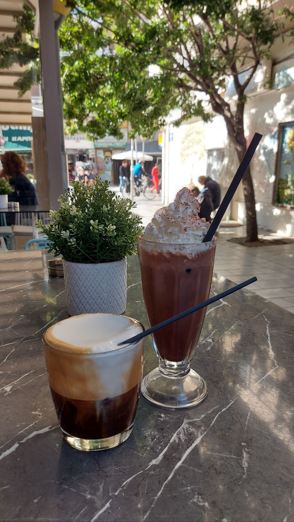 In einem kleinen Café teilen wir uns einen Wrap mit Salat und Frischkäse, ich nehmen eine kalte Schokolade und Fini ein Cappuccino Freddo dazu, das ist ein kalter Milchkaffee mit Eiswürfeln und wird hier an jeder Ecke angeboten.