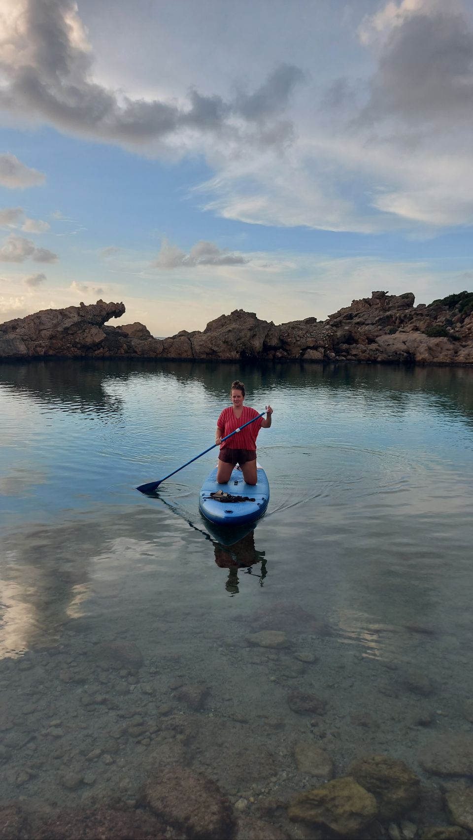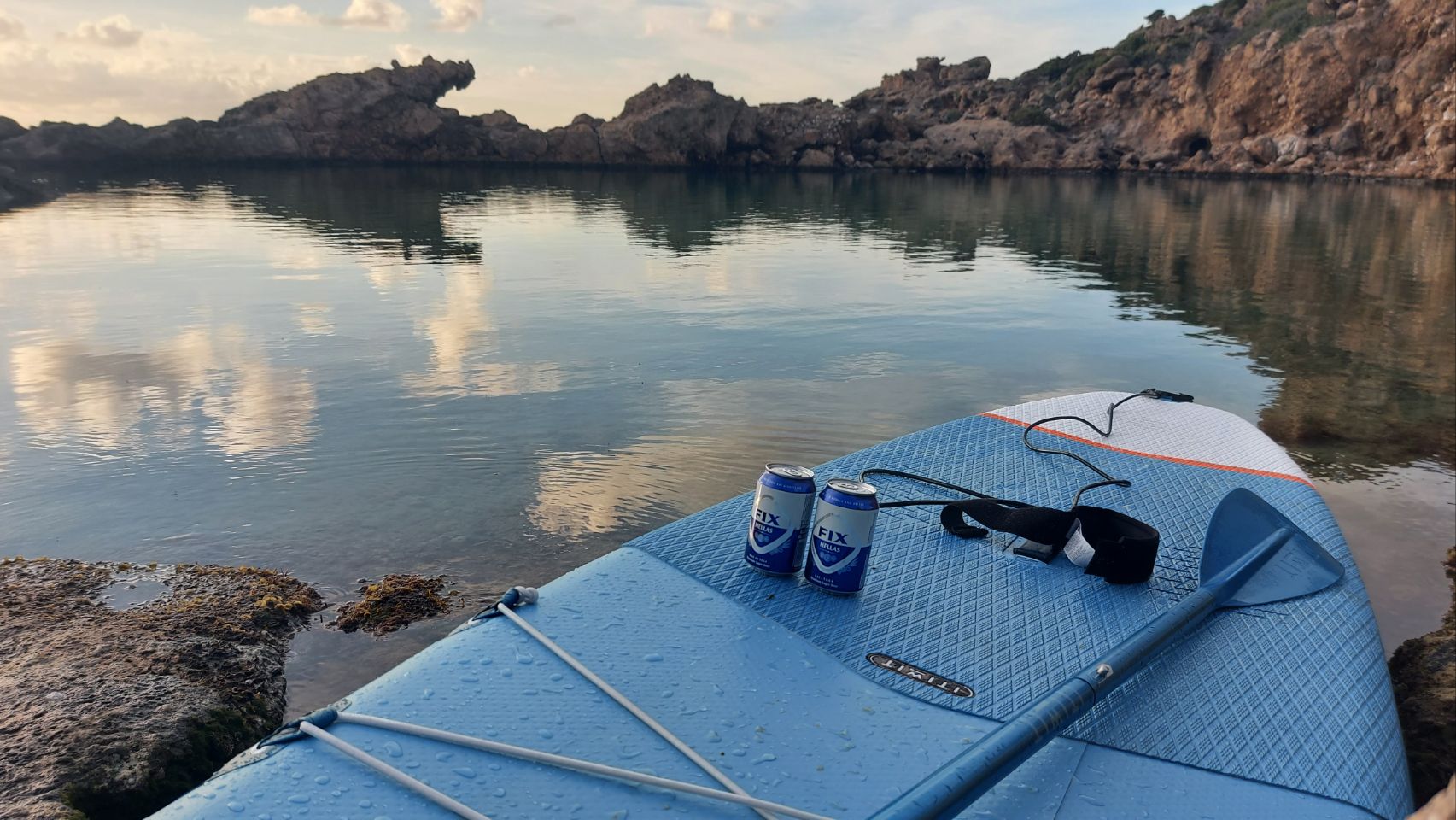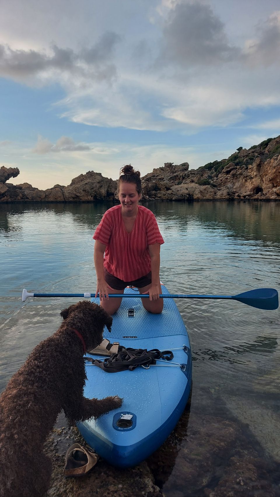 Die fast kreisrunde Bucht ist bis auf einen kleinen Durchgang von Felsen geschützt, eine befestigte Bootsrampe führt ins Wasser. Beste Voraussetzungen um das SUP startklar zu machen. Wenig später ist unser Flipper aufgepumpt und ich steche in See. Fini hat inzwischen die Drohne einsatzbereit und macht tolle Aufnahmen von der Landschaft. Als sie nach mir eine Runde paddeln will hält Flips es nicht mehr am Ufer, er springt ins Wasser und schwimmt ihr hinterher. Fini zieht ihn zu sich auf's Board und gemeinsam schippern sie in den Sonnenuntergang.