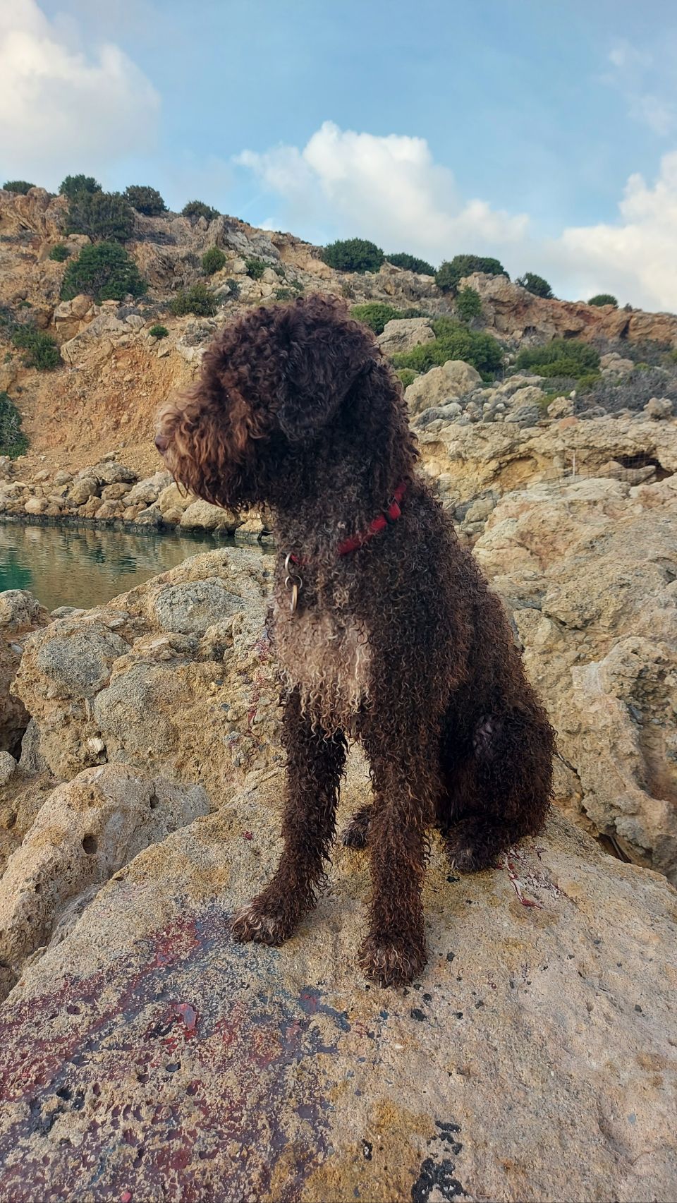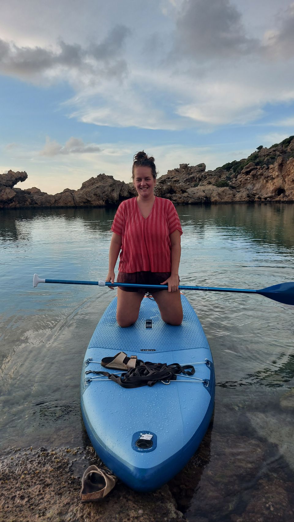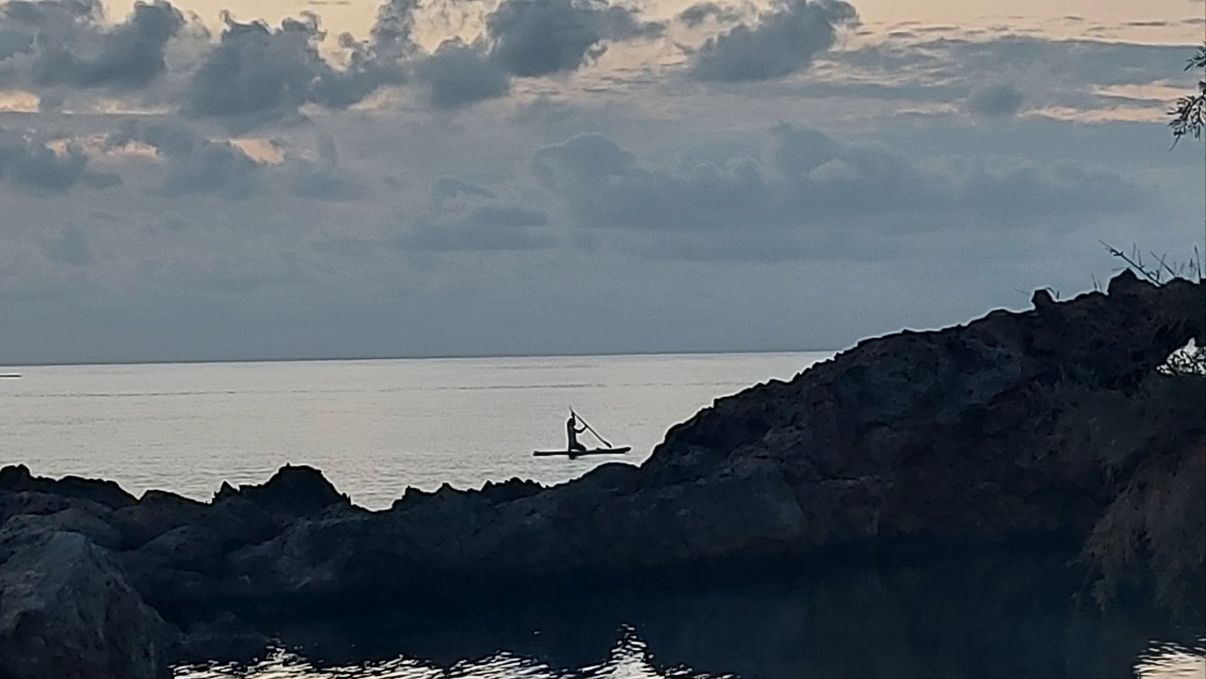 Die fast kreisrunde Bucht ist bis auf einen kleinen Durchgang von Felsen geschützt, eine befestigte Bootsrampe führt ins Wasser. Beste Voraussetzungen um das SUP startklar zu machen. Wenig später ist unser Flipper aufgepumpt und ich steche in See. Fini hat inzwischen die Drohne einsatzbereit und macht tolle Aufnahmen von der Landschaft. Als sie nach mir eine Runde paddeln will hält Flips es nicht mehr am Ufer, er springt ins Wasser und schwimmt ihr hinterher. Fini zieht ihn zu sich auf's Board und gemeinsam schippern sie in den Sonnenuntergang.