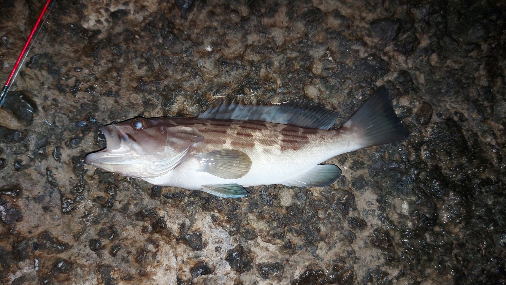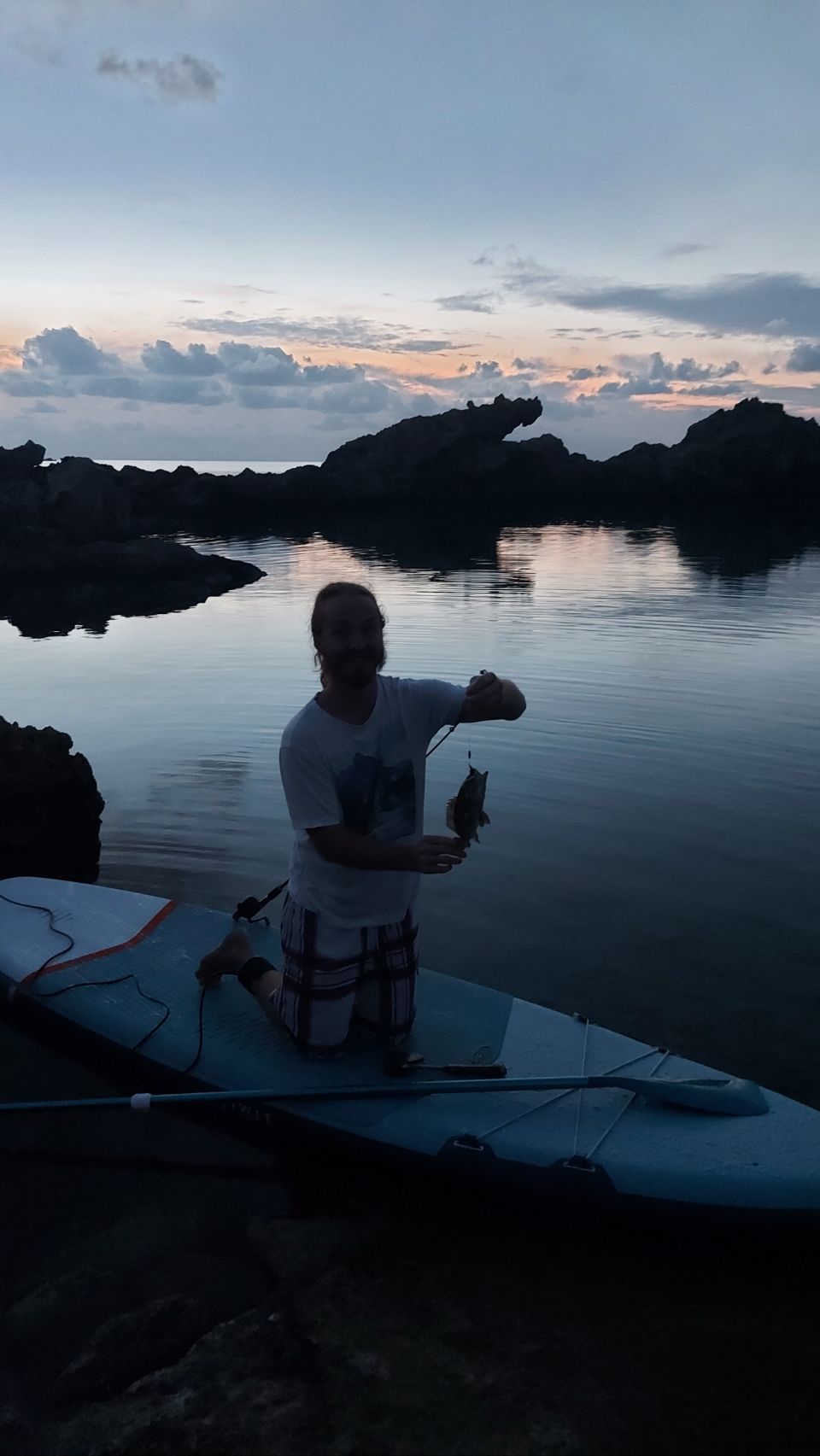 Gegen später, es ist fast schon dunkel, paddel ich nochmal raus und nehme die Angel mit. Als Köder verwende ich eine Kunststoffgarnele die ich hinter mir durchs Wasser schleppe. Gerade als ich zurück zum Ufer möchte zupft es an der Schnur, ein Barsch hat gebissen. Es handelt sich entweder um einen Zacken- oder einen Schriftbarsch, ganz sicher bin ich mir nicht. Mit etwas Butterbrot und geschmelzten Zwiebeln hat er uns auf jeden Fall geschmeckt.