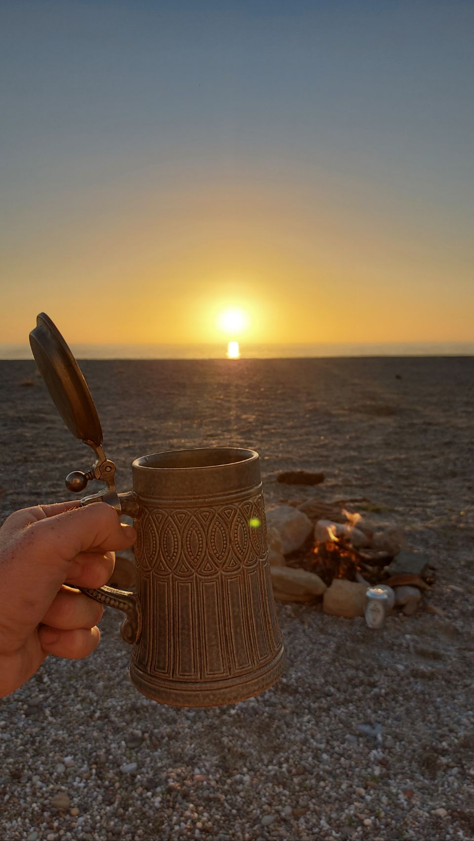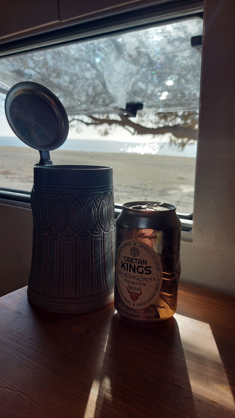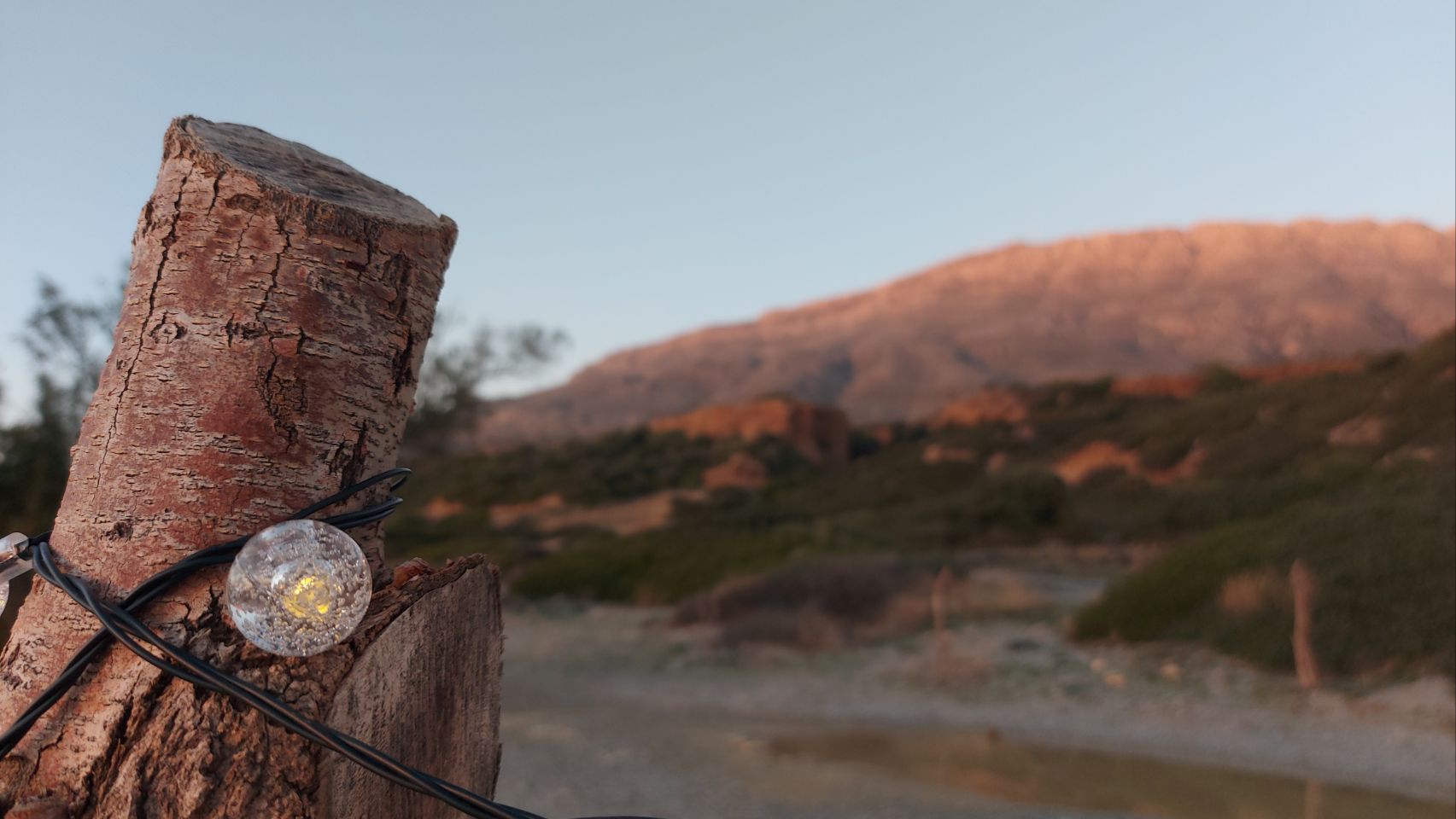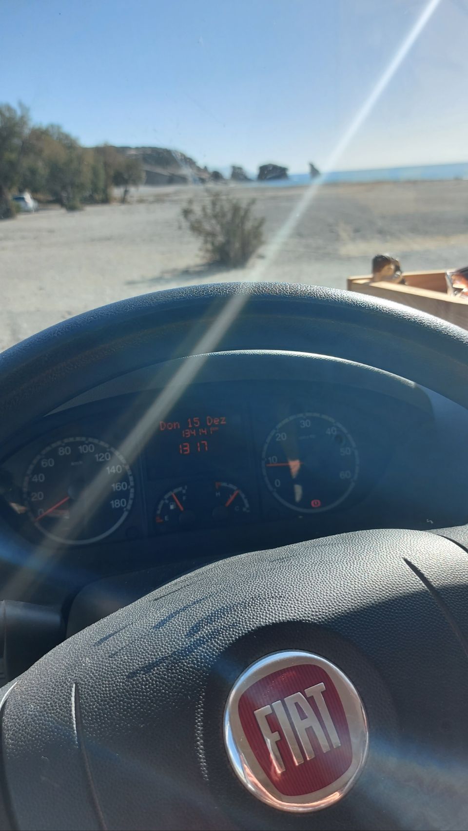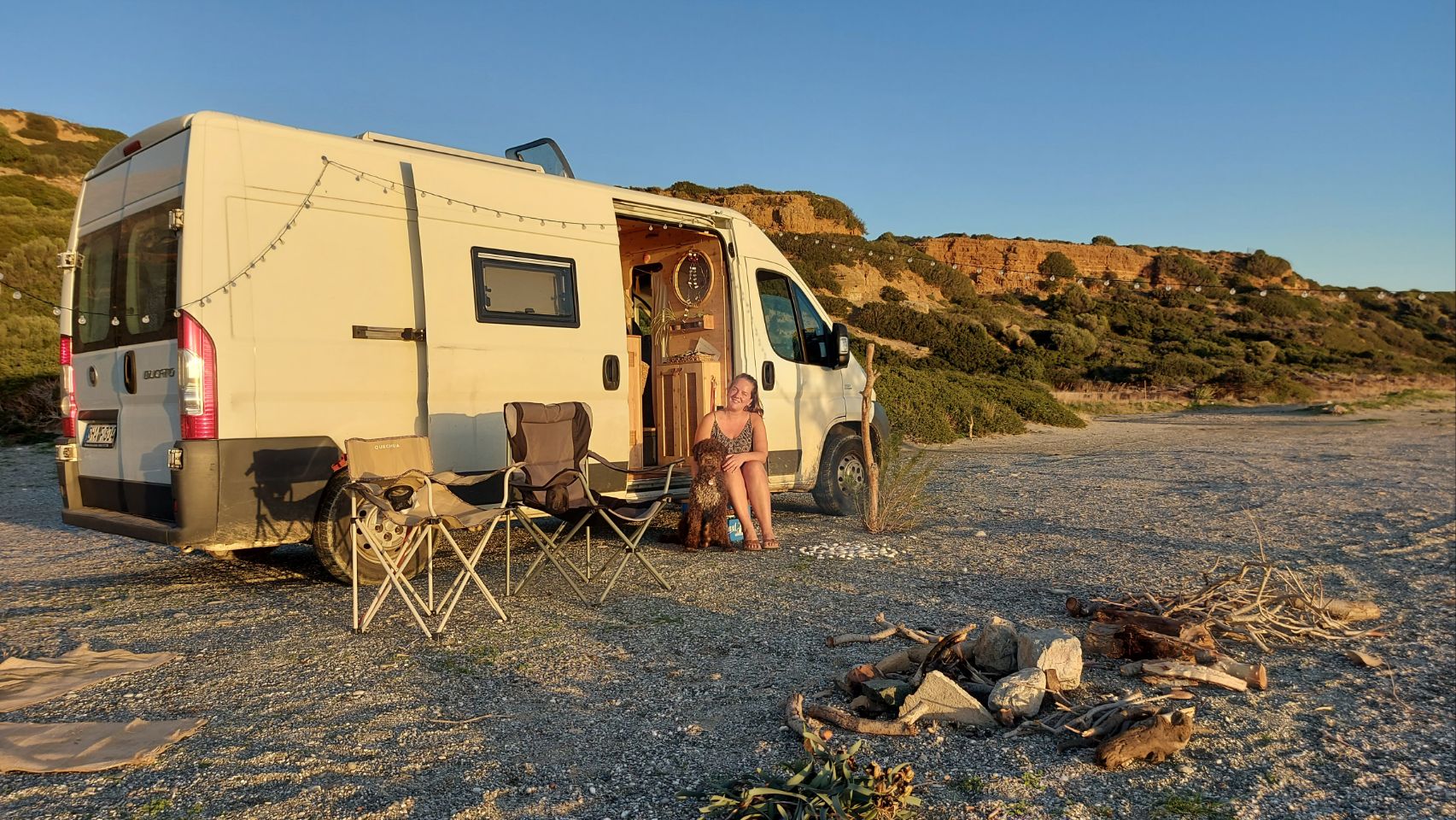 Vor einer geschlossenen Taverne halten wir an und essen eine Kleinigkeit zum Mittag im Bus. Es ist richtig schön warm heute und ich springe ins Meer. Fini und Flips erkunden die Gegend und entdecken etwas weiter am Strand einen gemütlicheren Stellplatz vor roten Felsen, neben einem Baum. Sie parkt Frido um und gerät dabei in losen Sand, es geht nicht mehr vor und nicht zurück. Mit Hilfe von unseren Fußmatten bekommen wir den Van aber wieder flott (siehe auch hier: https://youtube.com/shorts/U4nC3ZEMUO4?feature=share ) und beziehen den neuen Platz. Fini hängt unsere Lichterkette auf und ich sammel etwas Brennholz.