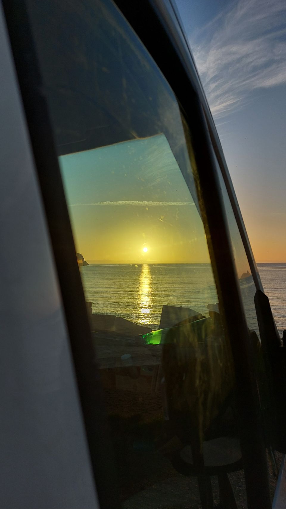 Wir wollen uns am Sonntag Matala anschauen und suchen uns auf dem Weg dahin einen neuen Stellplatz. Auf einem etwas kleinen und recht vollen Parkplatz über dem Strand von Kommos stellen wir uns zwischen zwei, drei andere Camper.