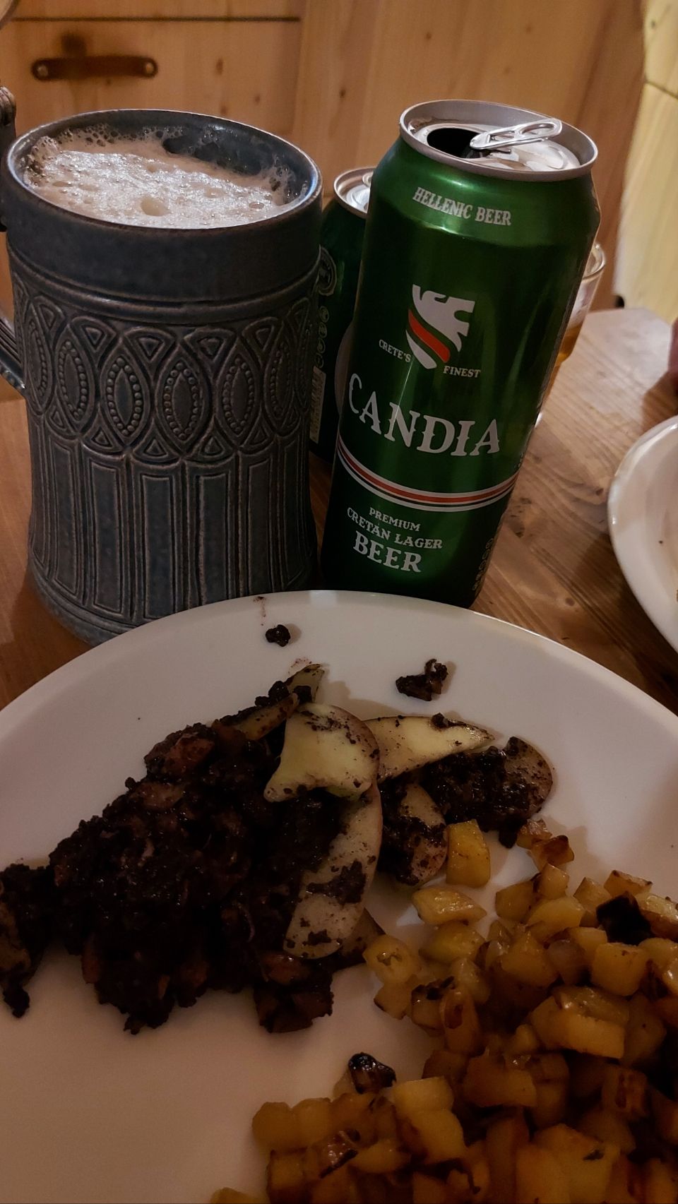 Wir genießen noch einen Sundowner und machen es uns im Bus gemütlich, als es dunkel wird. Zu Essen gibt es heute noch Bratkartoffeln und geschmelzte Blutwurst.