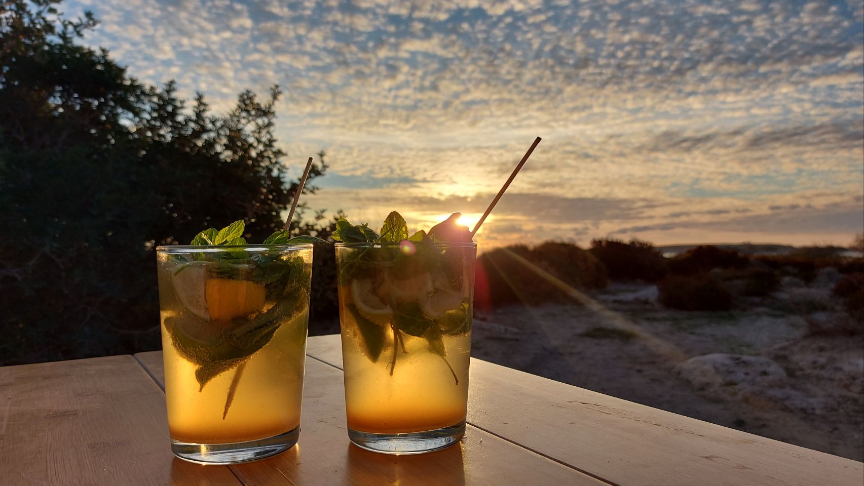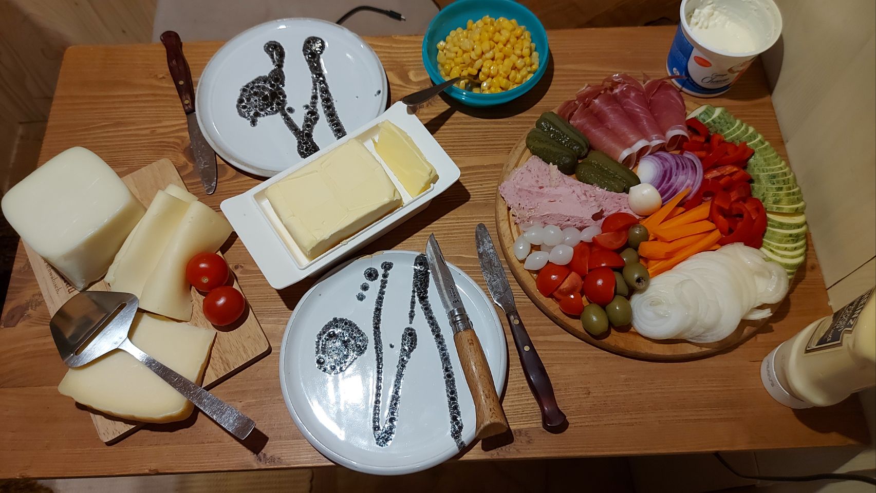 Für den Abend bereiten wir unser Raclette vor, legen Sekt und Havanna kalt, es gibt Mojitos! Im Bus stellen wir dann wieder unseren Campingtisch auf, hier steht die Pfanne auf dem Gaskocher und wird vielseitig eingesetzt. Schon bald bruzelt der Schinken und zerläuft der Käse, im Hintergrund läuft Dinner for One, was sonst. Weil das Essen so fürchterlich fettig war trinken wir zur Sicherheit einen Uzo.