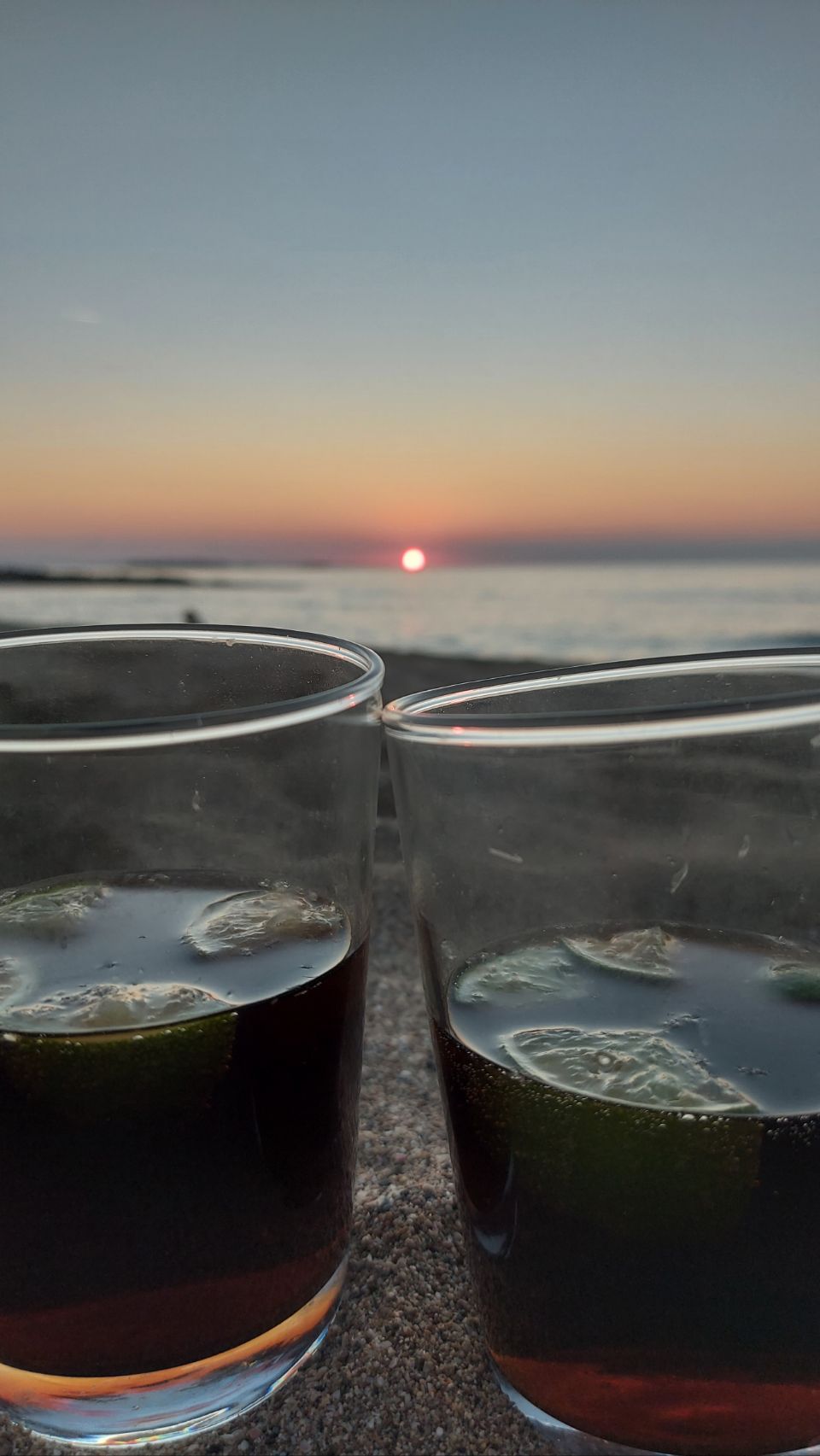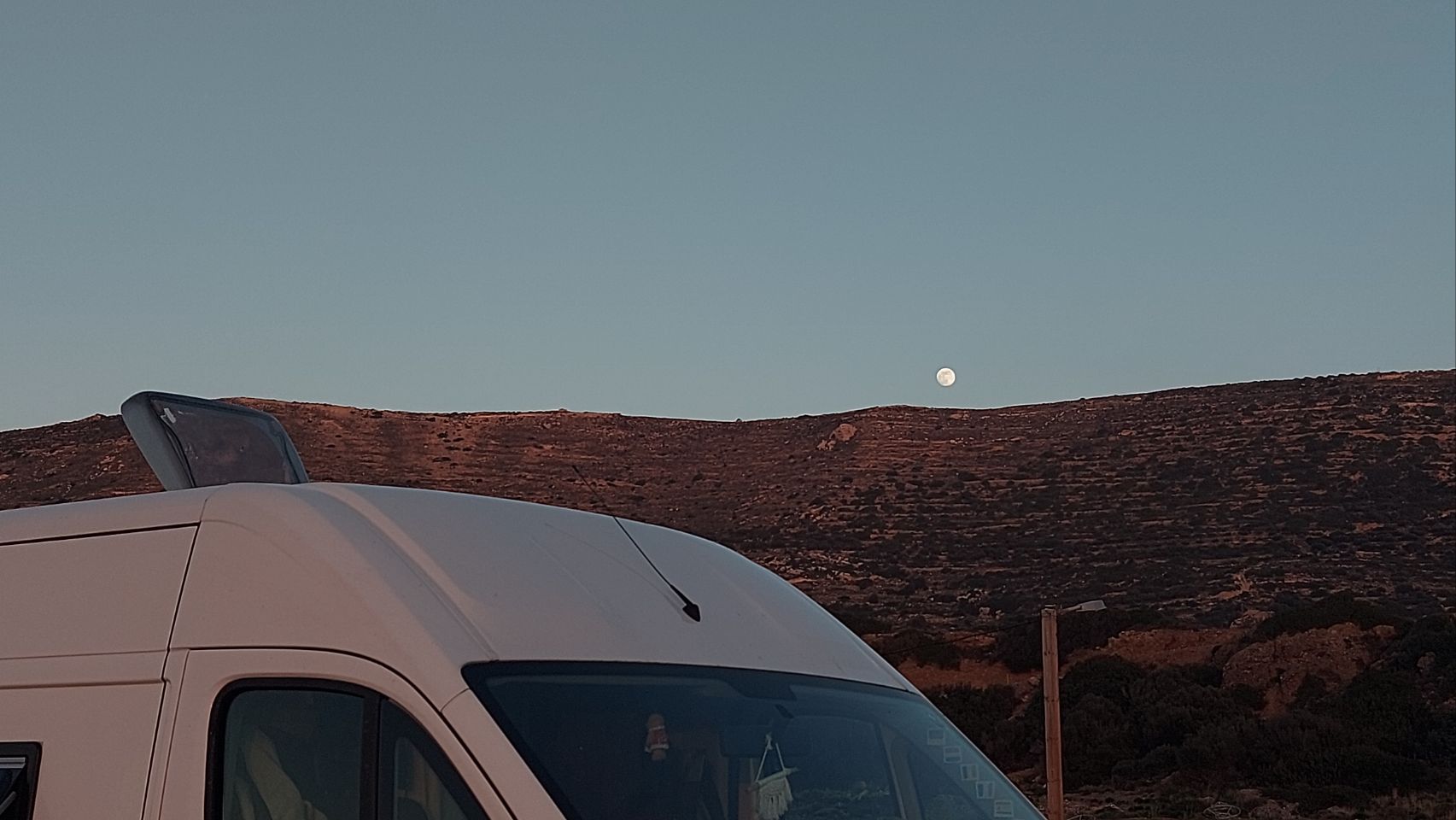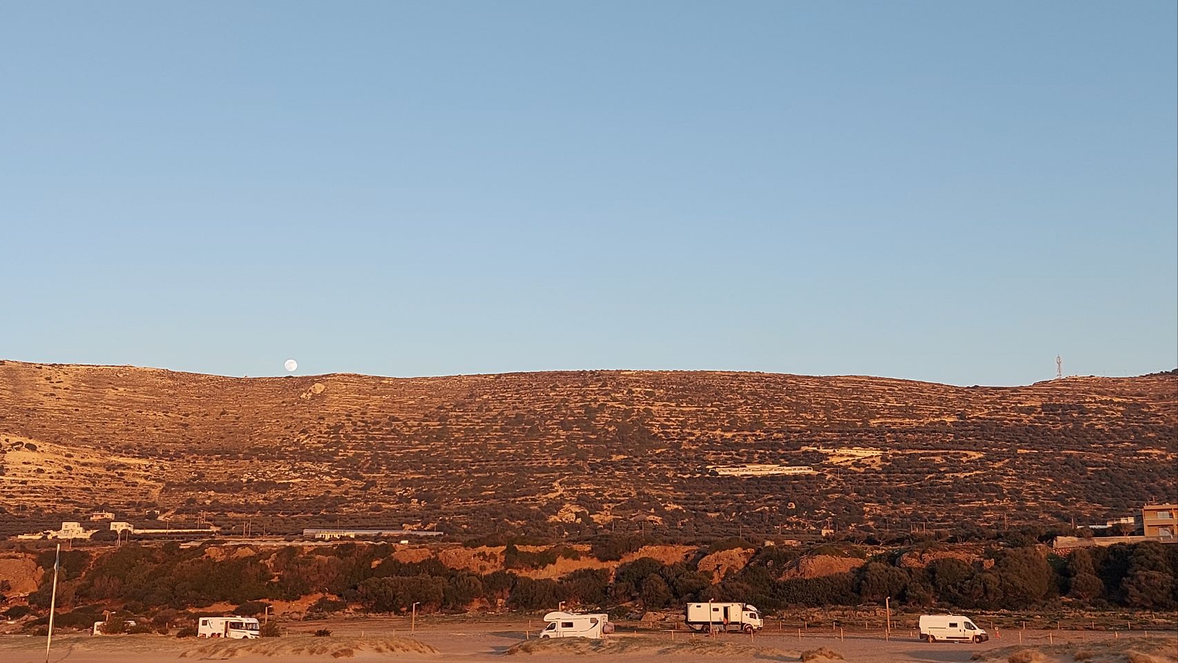 Zum Sonnenuntergang gibt es einen kühlen Drink und wir beobachten wie gleichzeitig der beinahe kreisrunde Mond über den Bergen hinter uns aufgeht.