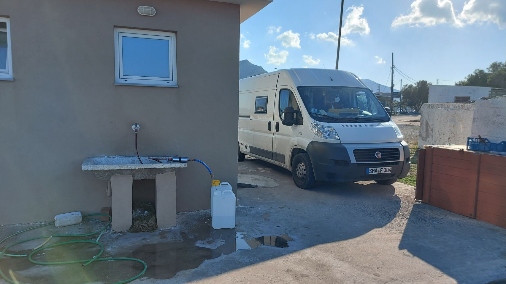 Zunächst halten wir an einem Supermarkt um einzukaufen, dann fahren wir an den Hafen. Hier waren wir Anfang Dezember schonmal zum Wasser auffüllen und wissen, dass es sicher und gut erreichbar ist. Mit allen drei Kanistern randvoll gefüllt und wieder verstaut geht des dann gegen Nachmittag an die Westküste zum Falasarna-Beach.