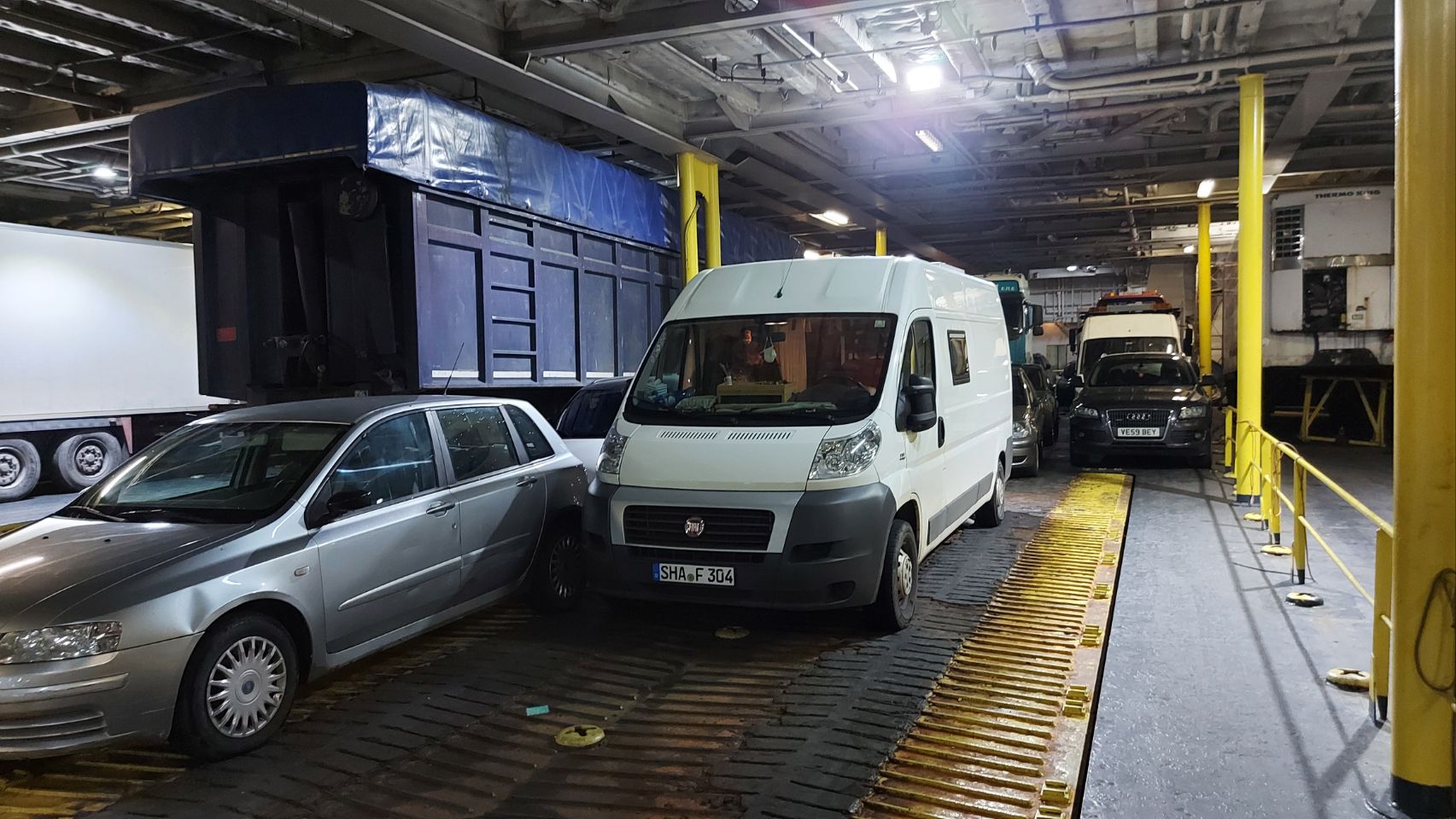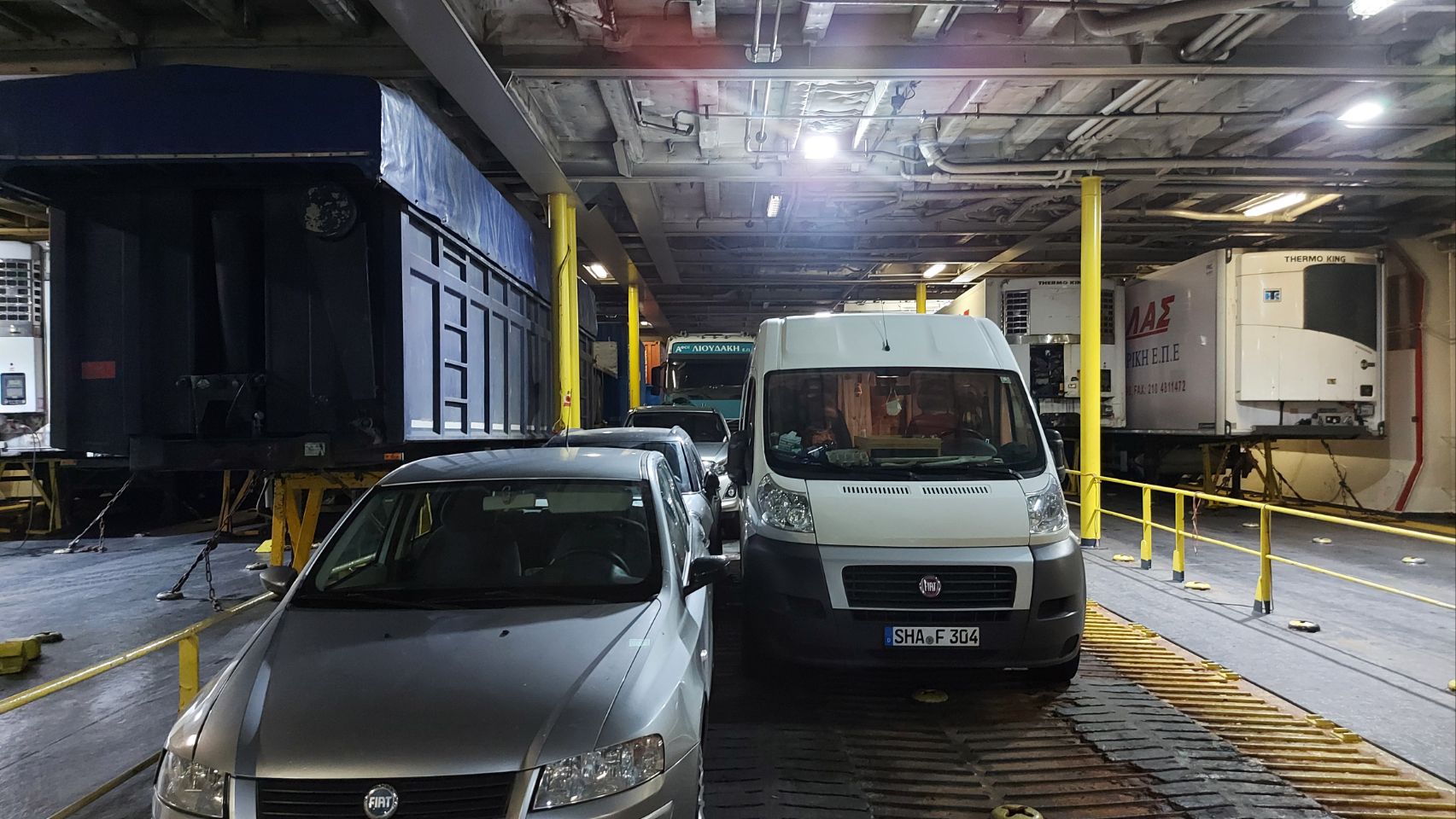 Vor dem Baumarkt belegen wir uns noch Vesperbrote, packen unsere Rucksäcke und machen uns dann auf dem Weg zum Fähranleger. Hier kommen wir auch zügig an die Reihe, unsere Tickets werden kontrolliert und wir werden im Autodeck eingewiesen.