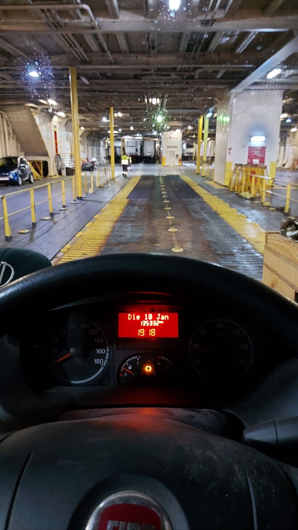 Um sechs Uhr klingelt Finis Wecker, kurz darauf schallt es aus dem Lautsprecher, dass das Schiff in Kürze in den Hafen einläuft und wir uns bereit machen können. Schnell die Zähne geputzt, angezogen und den Rucksack gepackt, stehen wir zwanzig Minuten später mit den anderen Fahrgästen im Warteraum vor der Rezeption. Es ist inzwischen kurz nach sieben. Dann können wir aufs Autodeck, wo wir nochmal eine gute halbe Stunde warten, bis wir mit Frido etwas platt aber erleichtert vom Schiff rollen.