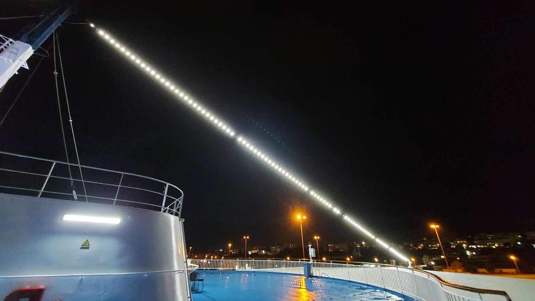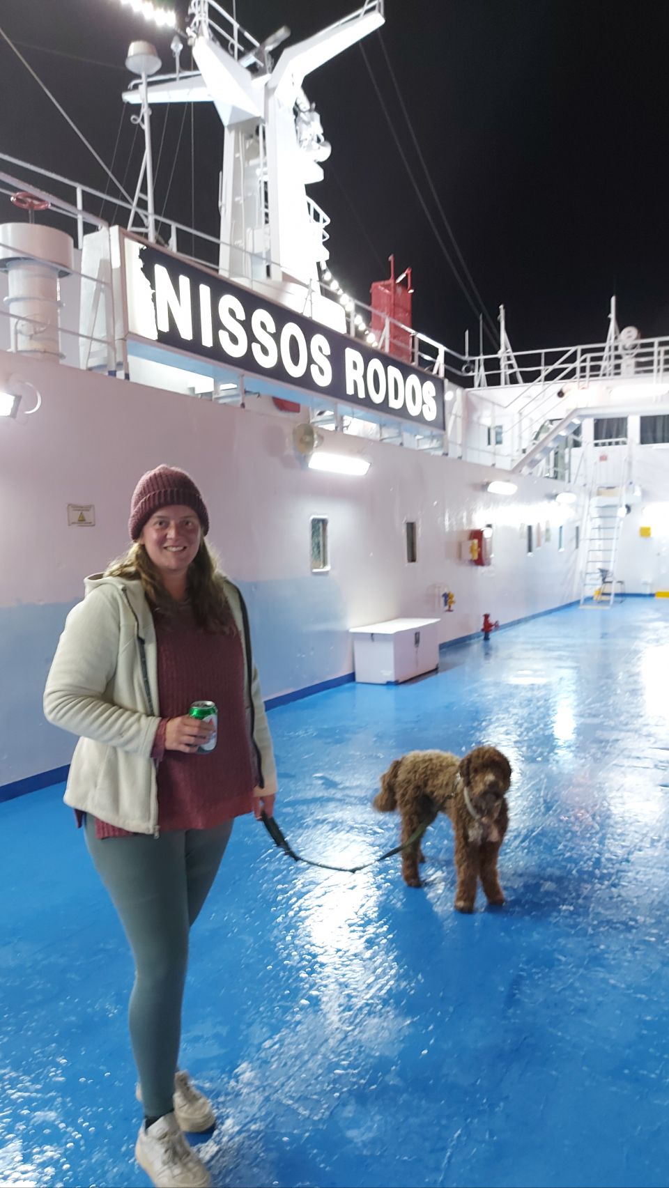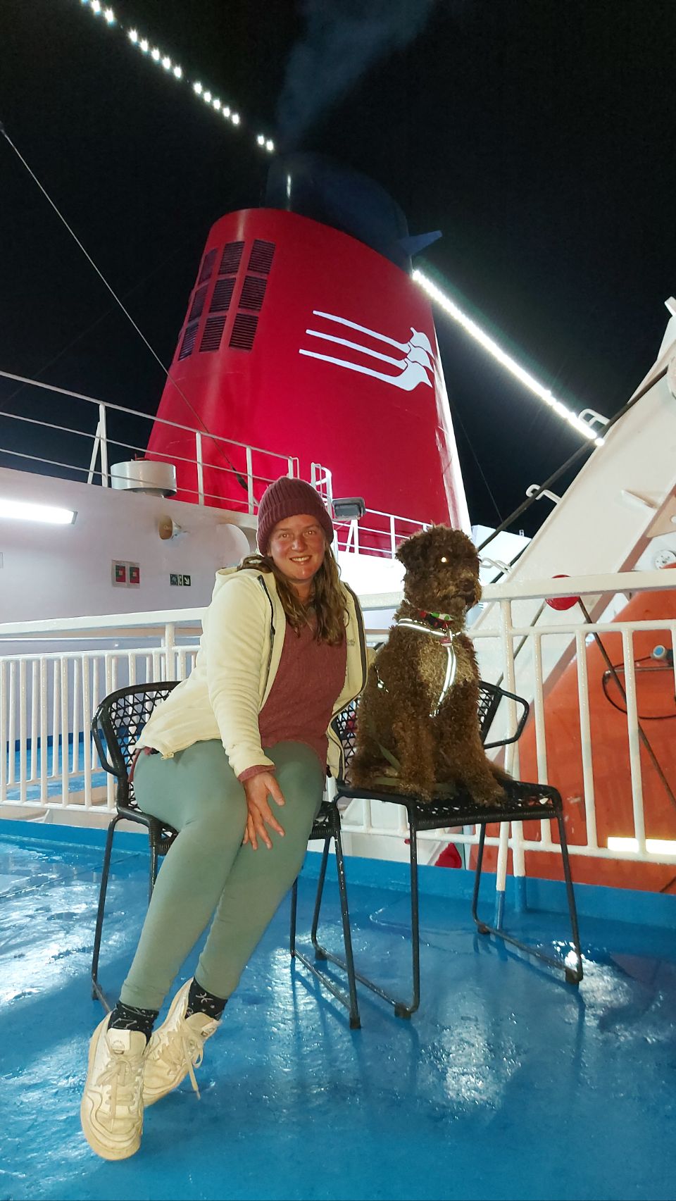 Gegen Mitternacht drehe ich mit Flips nochmal eine Runde übers Außendeck, die frische Luft tut gut. In Richtung Bug kommen wir aber nicht, der Wind ist einfach zu stark. Also verkriechen wir uns in unserer Kajüte und fallen in einen unruhigen Schlaf. Flips bellt immer mal wieder mit dem Hund in der Nachbarkabine um die Wette und der Seegang lässt einfach nicht nach.