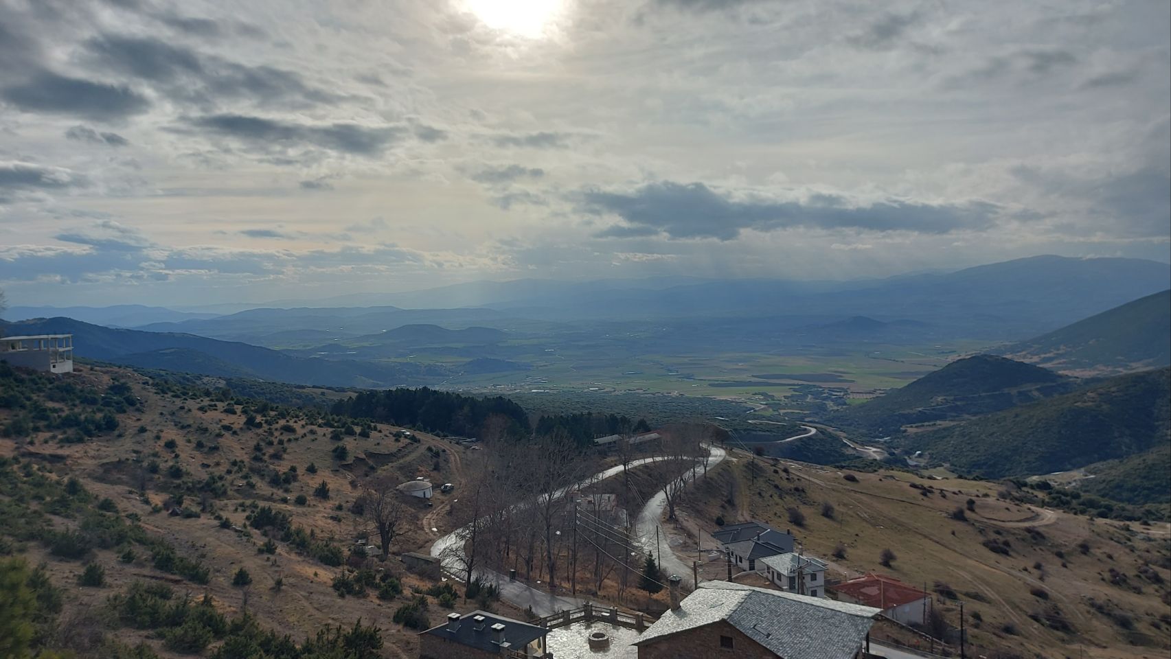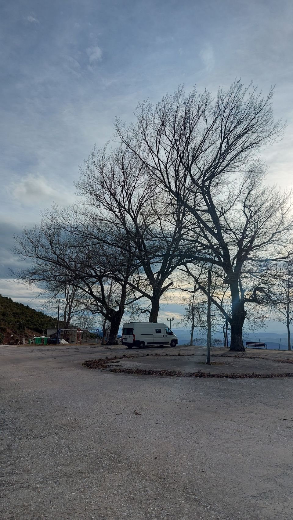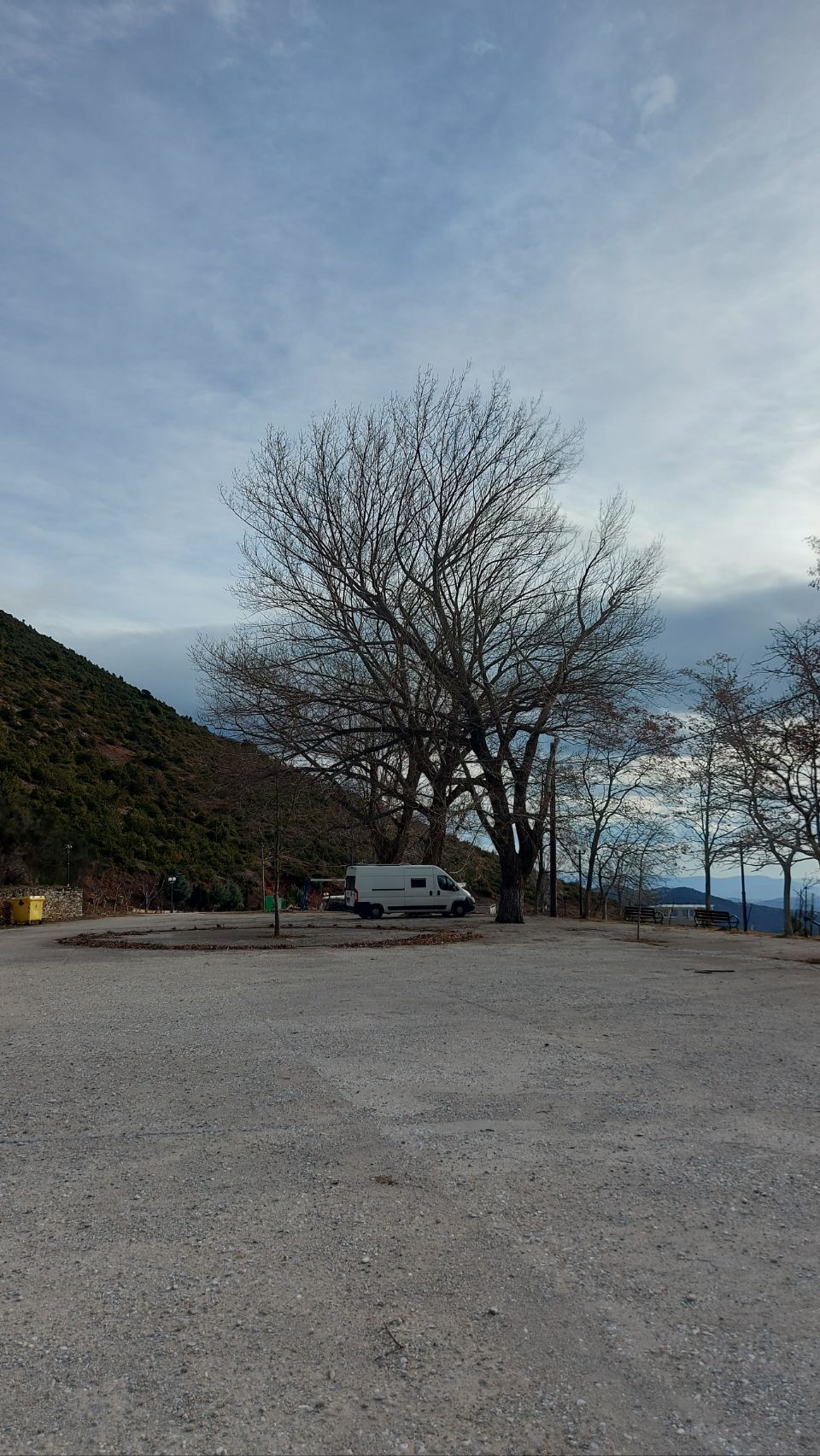 Auf der Westseite des Bergmassivs angekommen fahren wir die Ortschaft Kokkinopilos an. Ein kleines, verschlafenes Dorf, hoch oben im Hang, mit toller Fernsicht in die Landschaft. Es gibt hier einen größeren befestigten Platz der von hohen Bäumen überstellt ist. Wir beschließen hier für die Nacht zu bleiben.