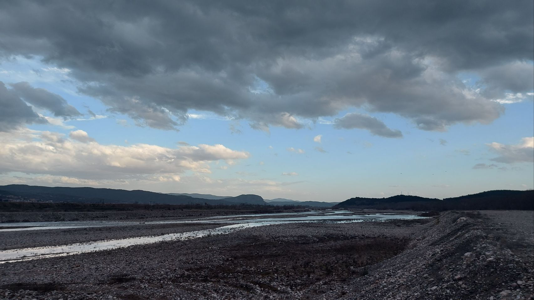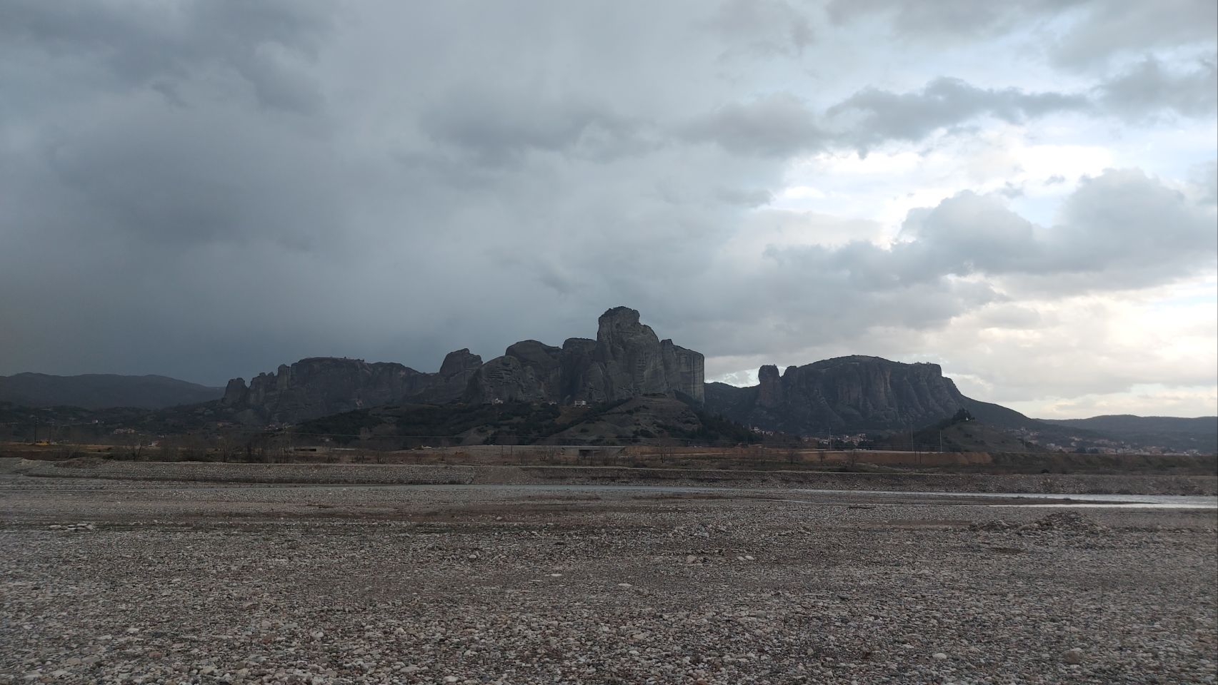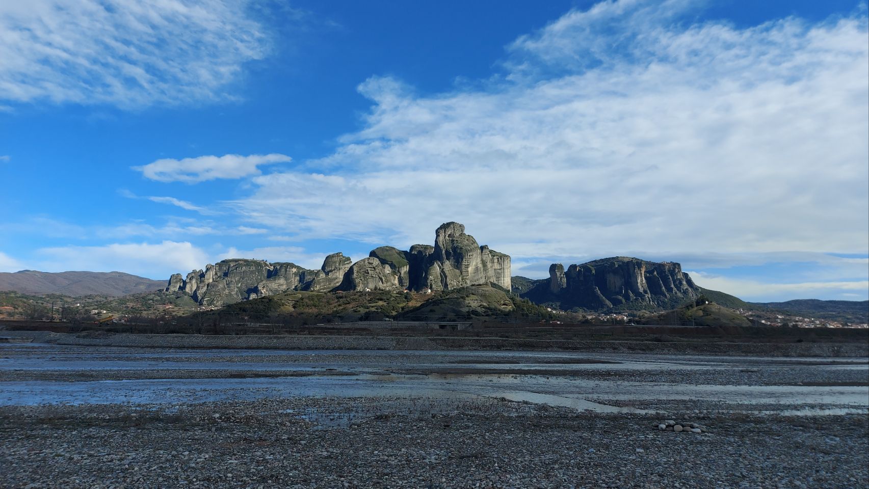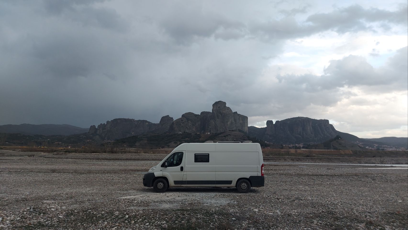 Etwas geschafft aber zufrieden kommen wir nach der Wanderung zurück zum Bus, machen Alles abfahrbereit und steuern dann einen Supermarkt in Kalambaka an. Hier hole ich schnell eine Kleinigkeit zu Essen und Getränke, dann steuern wir außerhalb der Meteora-Ortschaft einen Platz am Flußufer der oder des Pinios an. Wir parken auf eine Kiesstreifen und der Blick über Fluß und Städtchen zeigt uns nochmal die volle Breitseite der beeindruckenden Felsformationen.