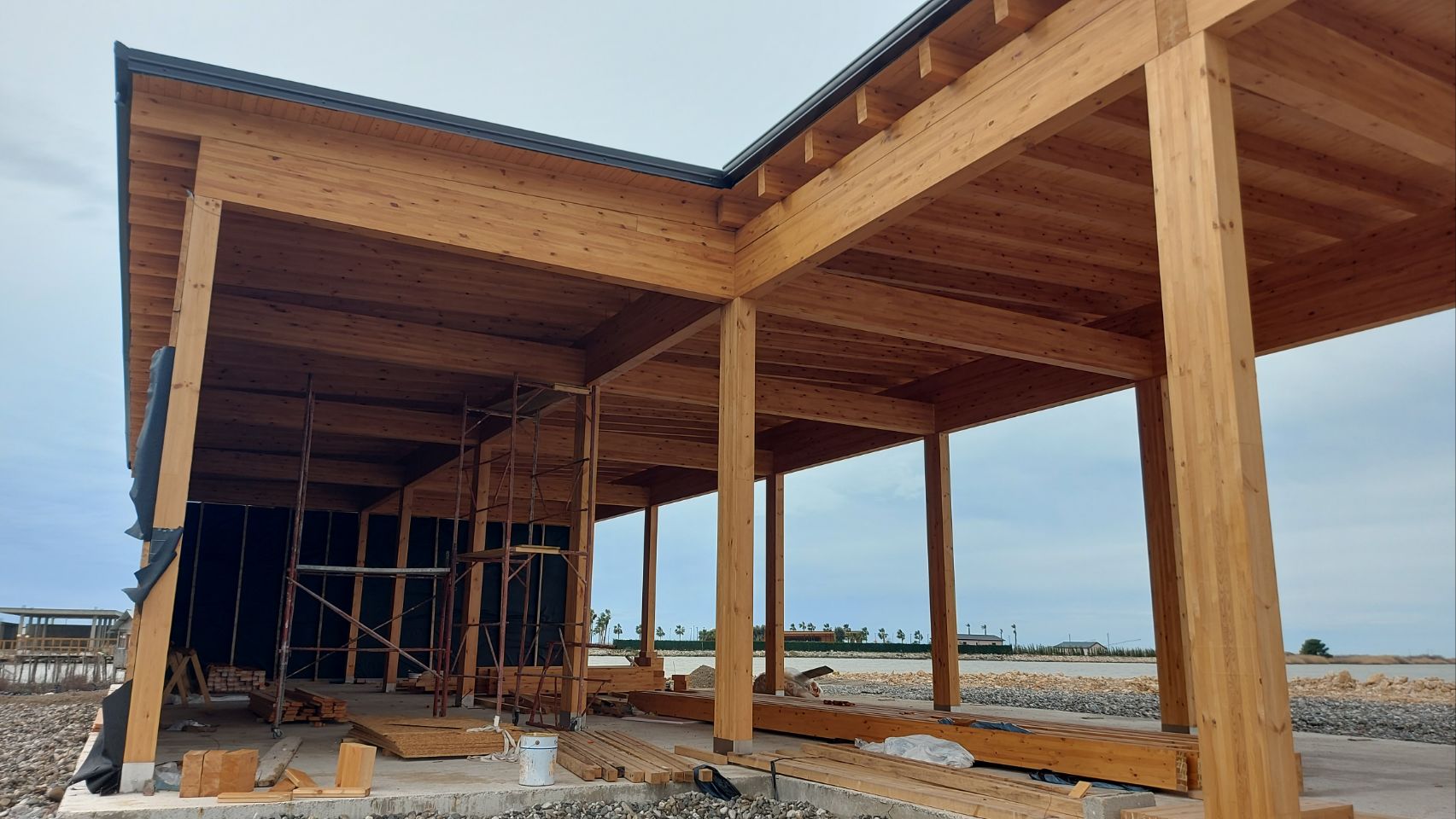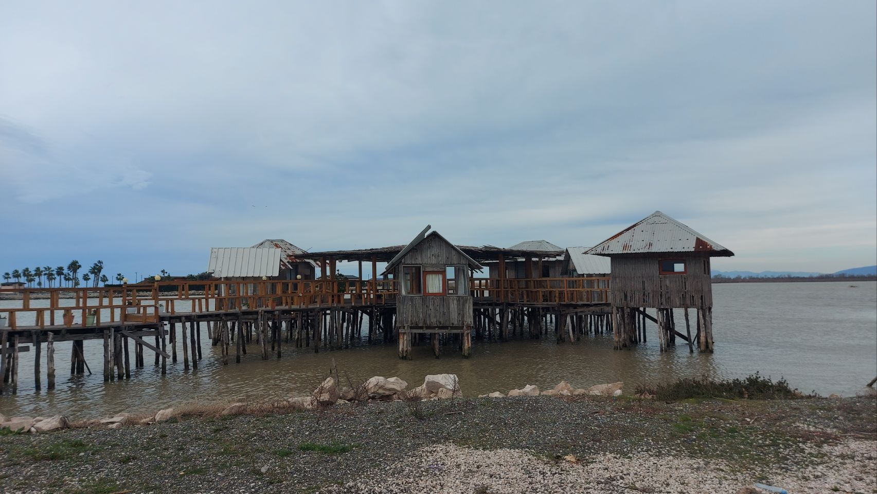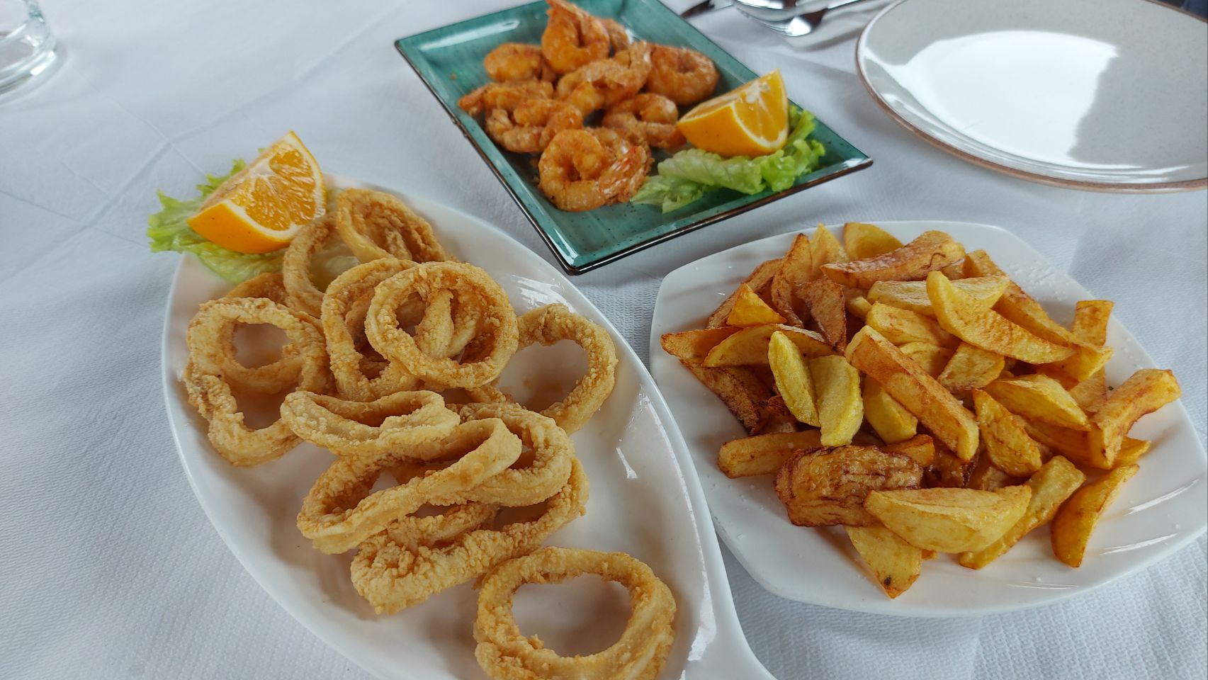 Auf unserer Runde entdecken wir, dass viele der Restaurants hier in der Lagune kleine, auf Stelzen gebaute Holzhäuschen im Wasser stehen haben die Platz für jeweils einen Tisch haben. Das gefällt uns und Fini wird prompt beim Fotografieren von einem Keller auf deutsch angesprochen. Kurz darauf finden wir uns dann in einer der Hütten wieder, ein Elektroheizer läuft und wir essen Pommes, fritierte Tintenfischringe und Garnelen.