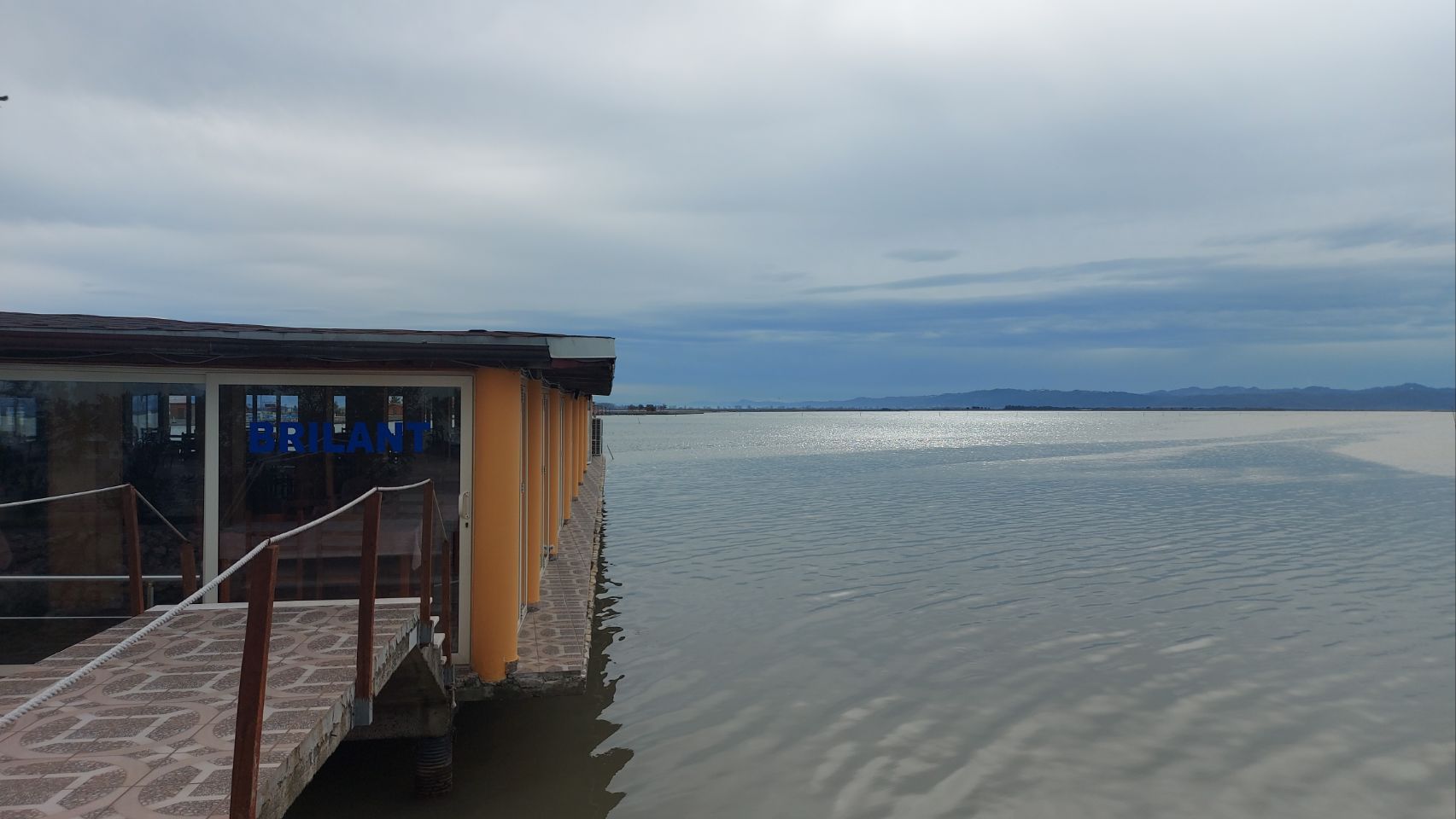 Zwischen sechs und halb sieben am Abend, Flips ist gefüttert und kann es sich im Frido gemütlich machen, gehen wir also ins Restaurant Brilant. Hier stehen bestimmt an die hundert Tische, in der Saison muss hier also ganz schön was los sein. Zwei Tische sind besetzt, entsprechend kommen wir uns etwas verloren in dem großen Lokal vor. Wir bekommen die Karte und stellen fest, dass außer den Überschriften Alles ausschließlich auf albanisch drin steht. Erstmal kein Problem, wir können mit unserem Router und den Handys wie gewohnt übersetzten, bis dem Akku von unserem kleinen Helferlein die Puste ausgeht. Was wir noch rauslesen konnten war eine Portion Gemüse mit Fisch, die wir auch für Zwei bestellen. Dazu einen Salat, eine Suppe und eine Portion Gemüsereis extra. Zu trinken wählt Fini eine kleine Karaffe Weißwein, ich ein Schwarzbier.