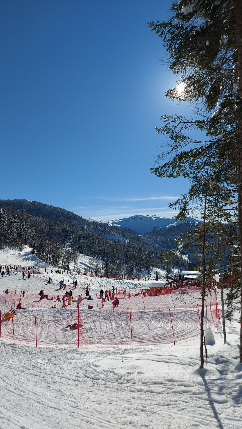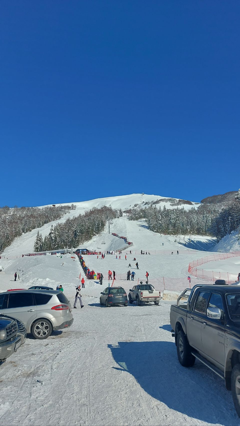 Nach einer guten Stunde im Schnee sind wir zurück am Lift. An den Stehtischen vor dem Restaurant und der Verleihstation für Equipment gönnen wir uns noch eine Kleinigkeit. Dann gehen wir zurück zum Parkplatz und lassen das Skigebiet Kolašin 1600 hinter uns.