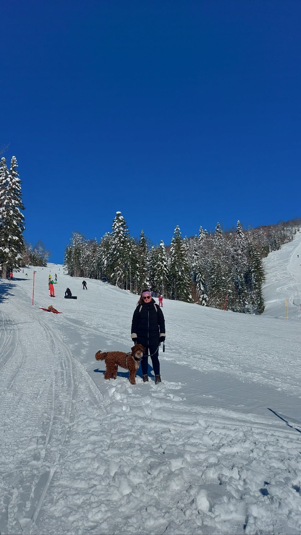 Eine schmale Straße führt nach Osten aus der Ortschaft raus und in die Berge. Die Strecke ist gut geräumt und wir kommen super voran. Wir lassen das untere der beiden Skigebiete Kolašin 1450 rechterhand liegen, fahren noch etwa fünf Minuten weiter und stehen dann vor einer Schranke. Um auf den Parkplatz zu kommen zahlen wir vier Euro, hier werden wir von einem Ordner eingewiesen. Zahleiche Autos stehen hier, wir hören laute Musik ganz aus der Nähe. Fini schnalt Flips sein Geschirr um, wir ziehen uns warm an und stürzen uns ins Getümmel. Es reizt uns tatsächlich mehr als gedacht nicht einfach ein Paar Ski auszuleihen um über die Piste zu wedeln. Aber mit Flips im Sessellift? Lieber nicht. Stattdessen stapfen wir zwischen den Bäumen den Berg hinauf, lassen den Trubel bald hinter uns und genießen den Berg.