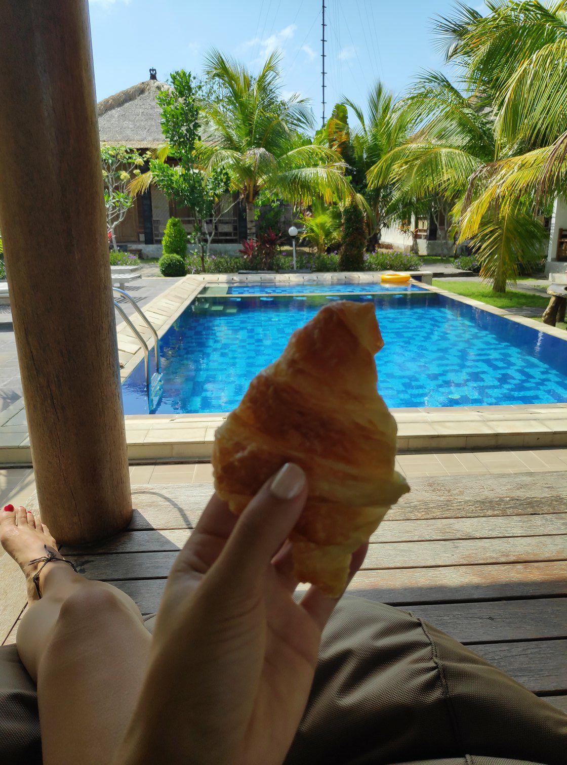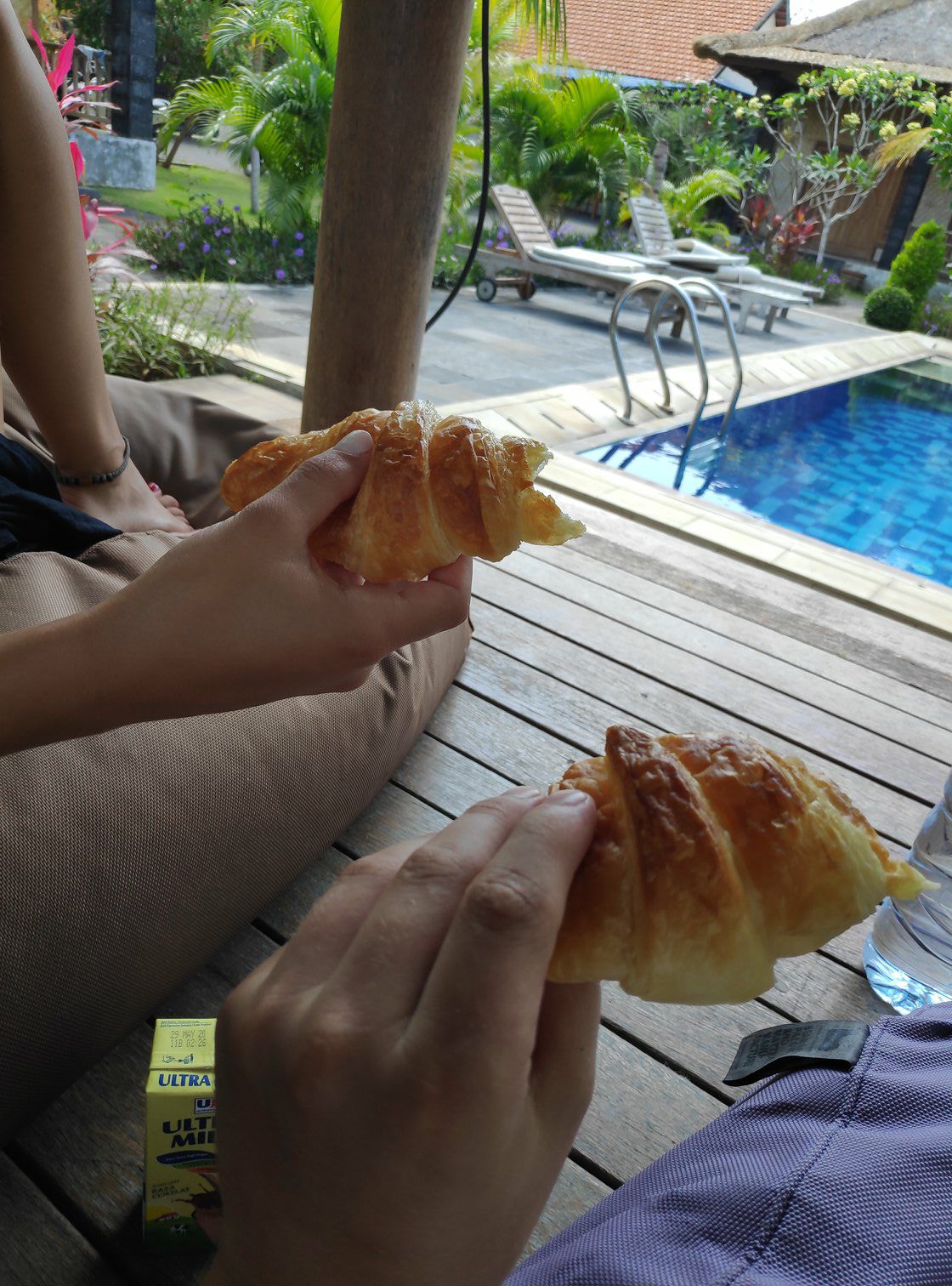 De eerste avond in Uluwatu hebben we onszelf tegoed gedaan aan te kleine, te dure, maar heerlijke gerechten bij het fancy restaurant om de hoek! We kwamen er daar ook achter dat ze croissants en chocoladebroodjes verkochten wat een welkome afwisseling was als ontbijt. Toast met ei is een prima start van de dag, maar net als de bergen nasi en mie goreng gaat dat op den duur vervelen.