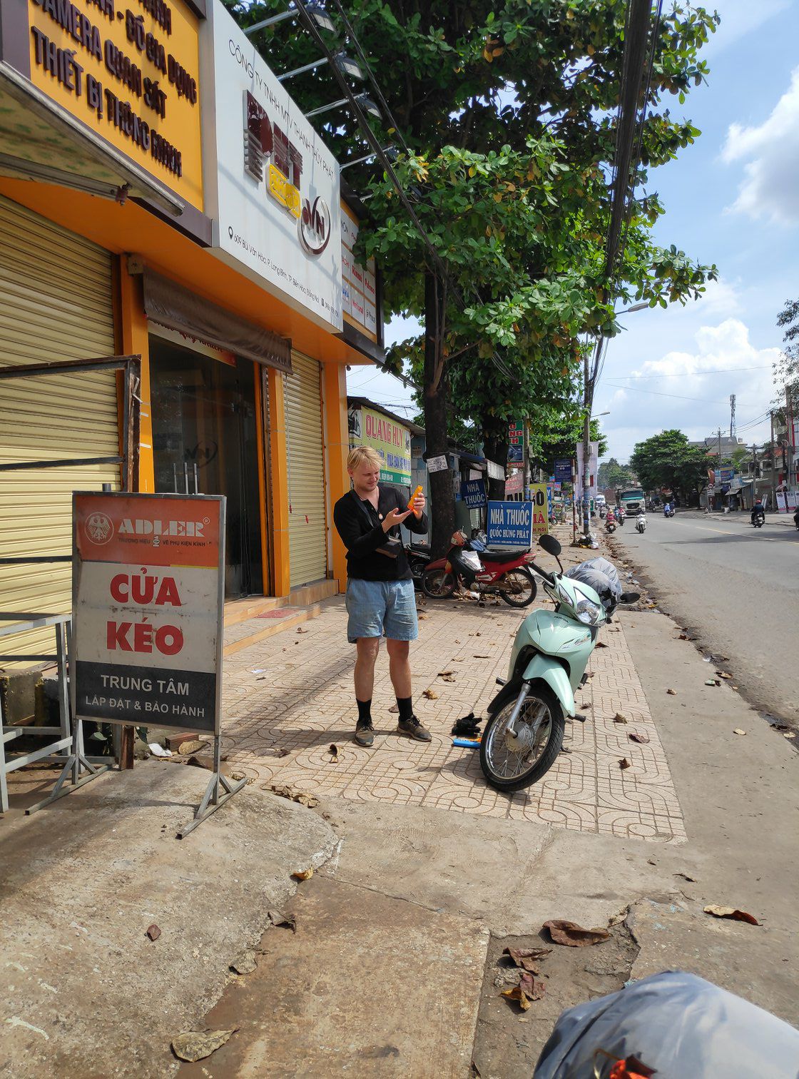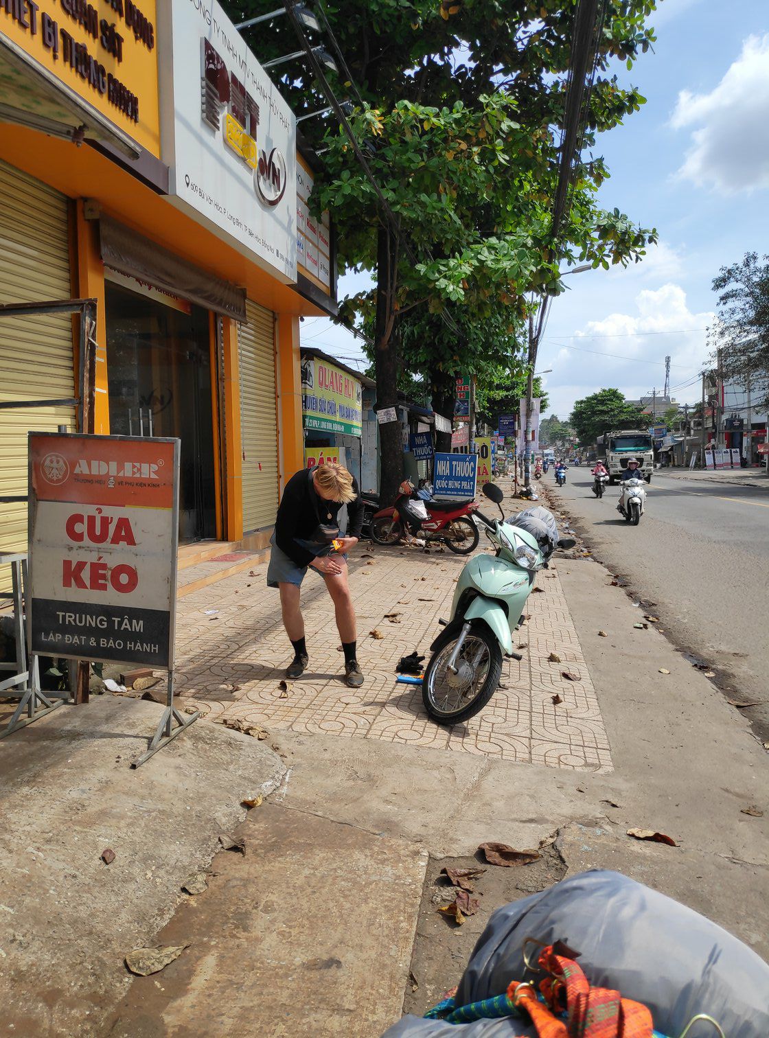 De eerste rit van ruim vier uur overleefd! Ho Chi Minhstad uitkomen ging verrassend makkelijk. Onderweg een aantal keer moeten stoppen om de tere huid van Friso in te smeren.