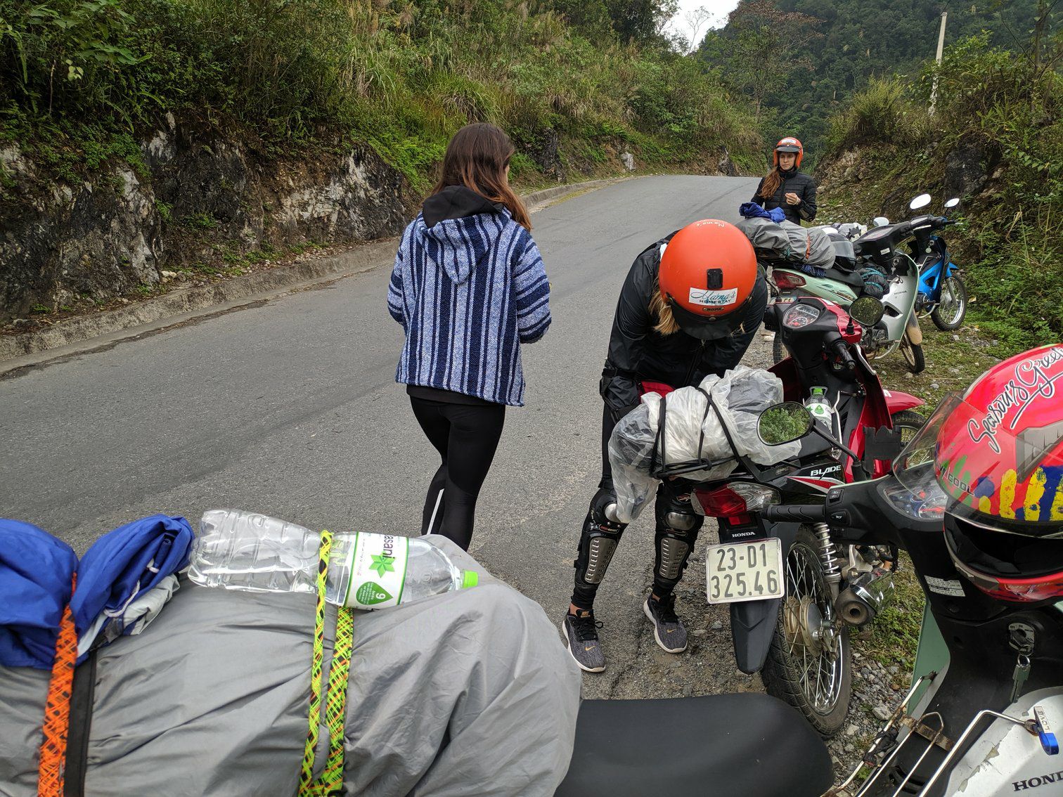 Met een groepje van vijf zijn we de loop gestart. Een Nederlandse meid Evelien, een Franse meid Estelle en een Zwitserse jongen Fabian sloten bij ons aan. Na tien minuten was de toon gezet. Estelle haalde het gas en de voorrem midden in een bocht door elkaar. Dit resulteerde in een enorme smakkerd. Gelukkig kwam ze er goed vanaf en hadden we met Evelien een geneeskunde student bij ons. Onze EHBO-kit mocht ook een keer uit de tas worden gehaald.