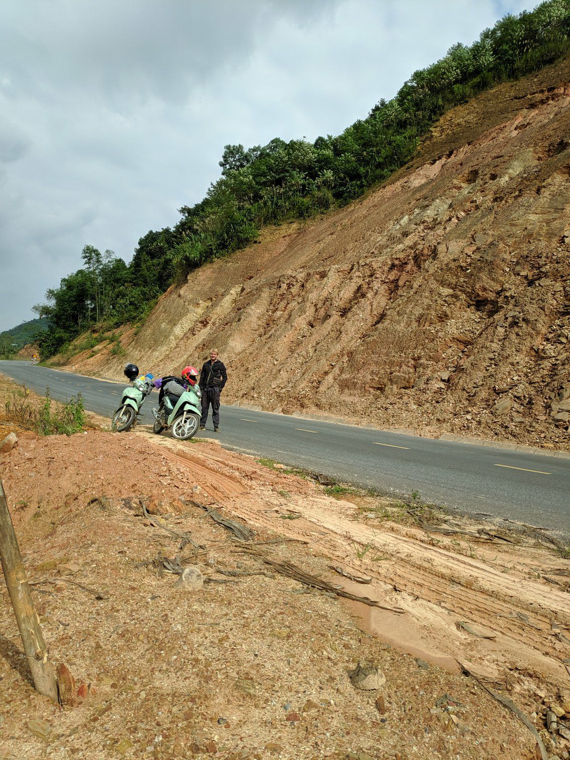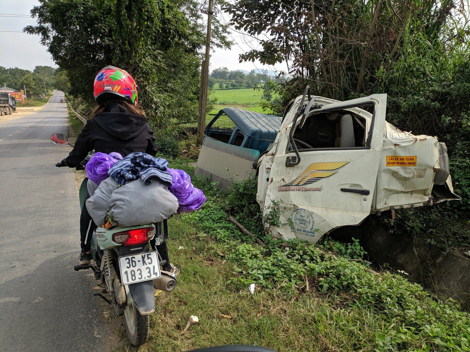 De rit naar de ene laatste overnachting duurde maar zo'n twee uur. We hebben het dan ook lekker rustig aan gedaan met veel pauzes. Onderweg werd het maar weer eens duidelijk dat rustig aan doen op de Vietnamese wegen loont. We kwamen een volledig in de prak gereden busje in de greppel tegen. Overigens niet het enige ongeval wat we onderweg gezien hebben.