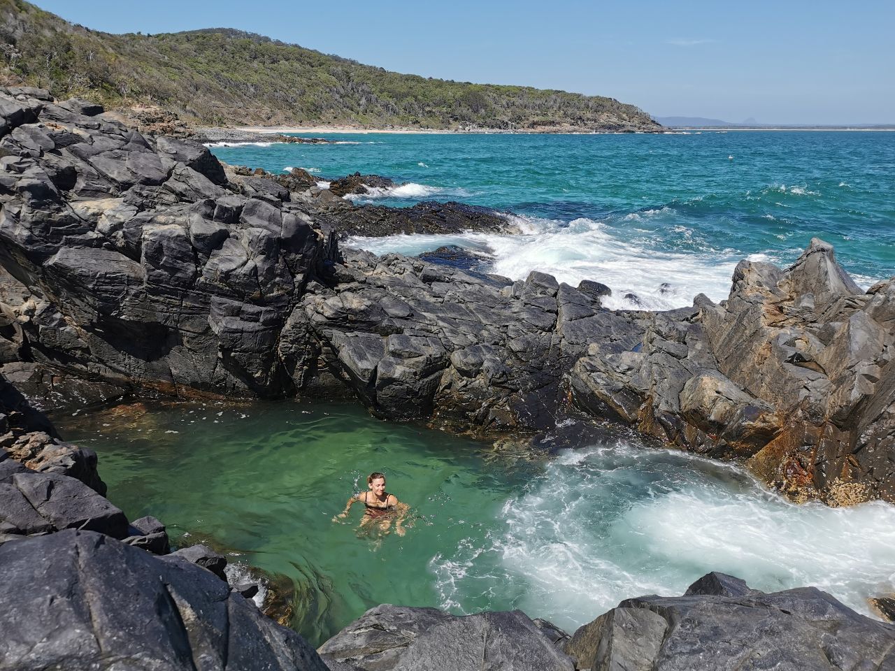 😊 Vroeg uit de veren na een goede nachtrust voor een stevige wandeling in het Noosa National Park. We wandelden ongeveer 7km aan de kustlijn en door regenwoud, prachtig gewoon! Om af te koelen van de brandende zon ☀️, namen we een duik in een natural pool en in de namiddag zijn we gaan zwemmen in zee 👙🌊