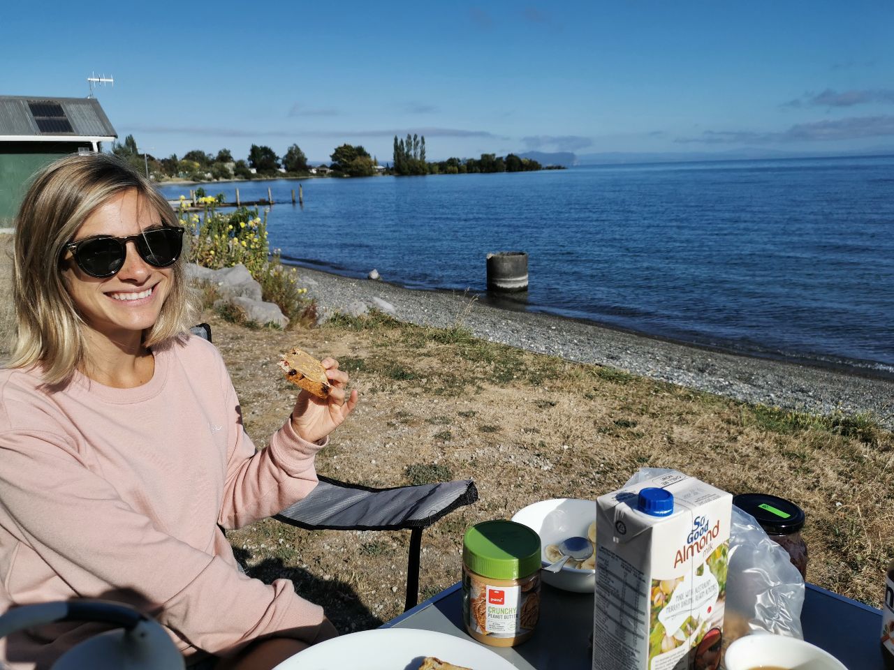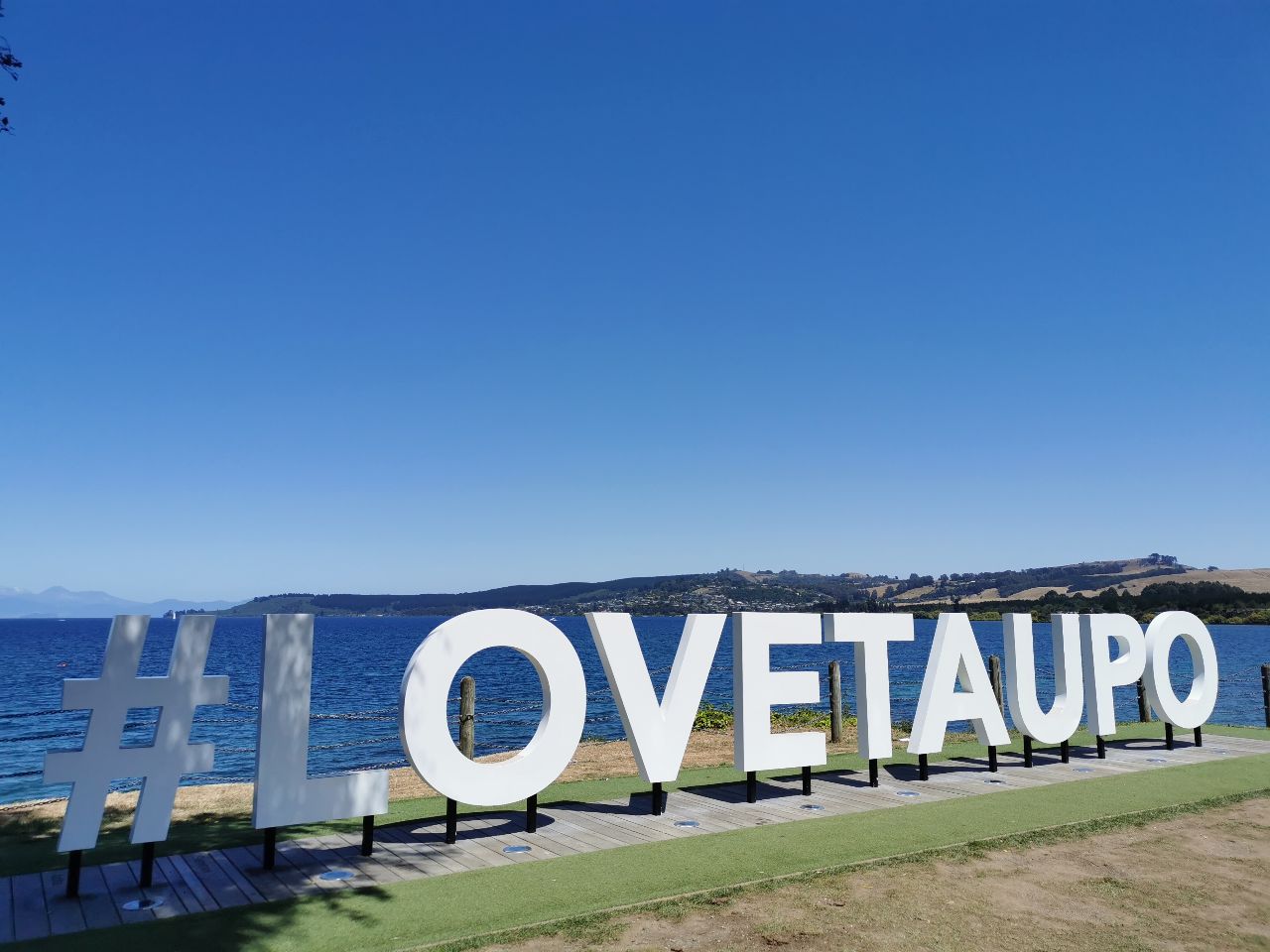 Na het ontbijt aan de oever van het meer (favoriete ontbijtplek tot hiertoe!๐๐ฅโ) reden we op een halfuurtje tijd het centrum van Taupo binnen.