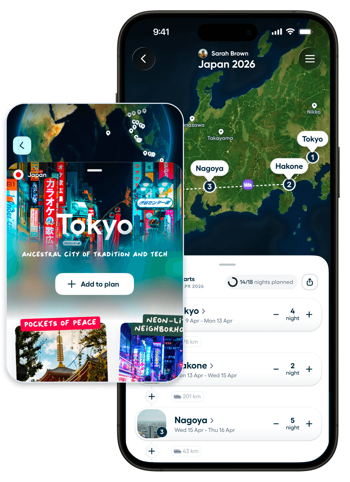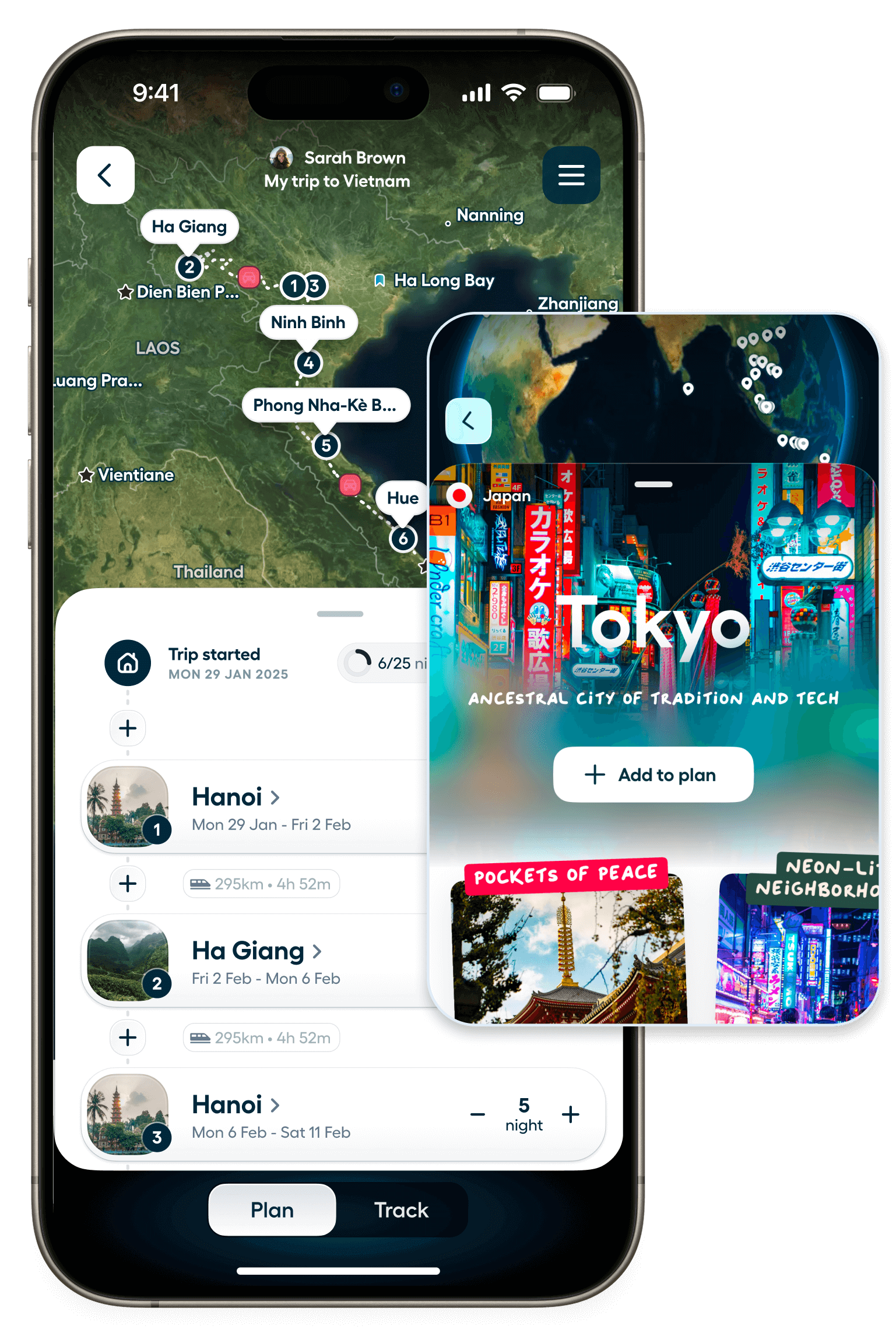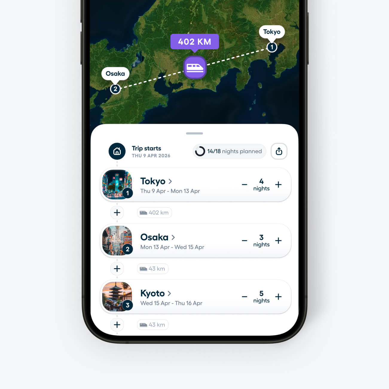 Als je plan vorm begint te krijgen, voeg je bestemmingen en datums toe en zie je je route op je kaart tot leven komen. En als je van gedachten verandert, kun je alles makkelijk verslepen, verwijderen en veranderen.